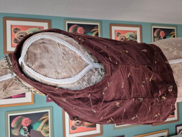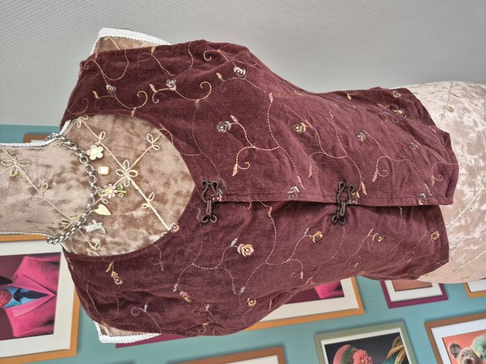 Gilet sans manches en velours vintage. Très bon état (voir photos). Taille S/M (voir mesures plus bas). Coloris = bordeaux à motif de fleurs brodé. Fermeture par 2 crochets. Aucune étiquette. Mesures à plat = Largeur aux épaules = 33cm environ. Largeur aux aisselles = 45cm environ. Longueur = 46cm environ. N'hésitez pas à me contacter si vous avez des questions. Je vous répondrai dès que possible.