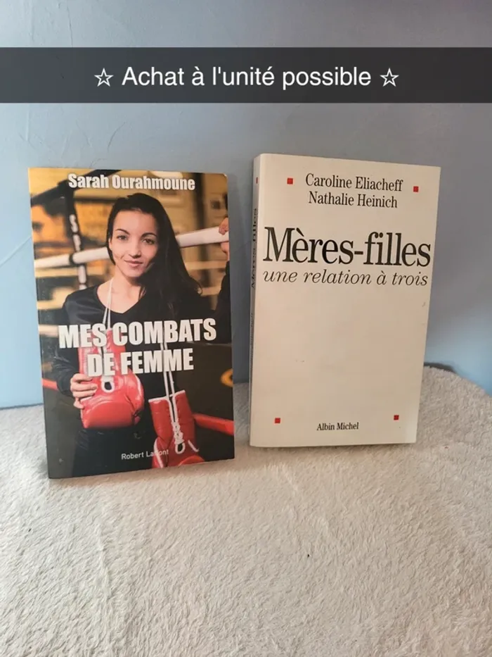 ⇨ Achat à l'unité possible // Plus de photos sur demande Lot de 2 livres : . Livre Mes combats de femme De l'auteur Sarah Ourahmoune * D’occasion, la couverture est abîmée, surtout à l’arrière. Sur la couverture arrière, il y a aussi des taches. Les pages ont jauni et sont un peu tachées sur le bas. Il manque la 1ere page blanche. ➺ Informations : . Prix à l'unité - 2€ . Éditions Robert Laffont . Livre en Français _____________________________________ . Livre Mères-filles une relation à trois Des auteurs Caroline Eliacheff / Nathalie Heinich * D’occasion, la couverture est tachée et un peu abîmée. Les bords des pages sont tachés et abîmés. ➺ Informations : . Prix à l'unité - 2€ . Éditions Albin Michel . Livre en Français