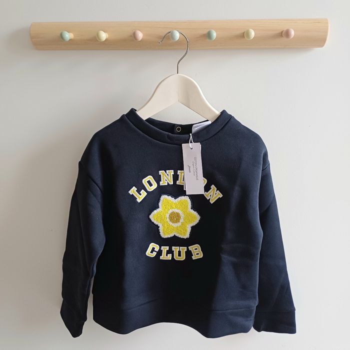 - Sweat en coton biologique molleton - Lettrage "London Club" imprimé - Badge bouclette fleur brodé - Ouverture pressionnée au dos 6 ans Neuf avec étiquette