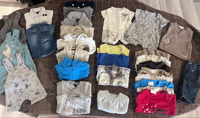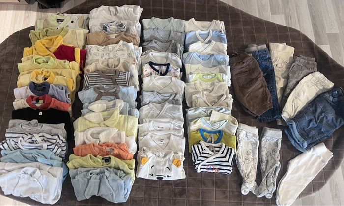 En très bon état🌸 Le lot comporte au total 103 pièces 25 pyjamas 19 bodies manche longues 4 bodies manche courte 7 pantalon 3 bas 3 salopette 2 chemises 4 gilet à capuche 4 gilet sans capuche 1 pull 1 brassière 3 tee-shirts manches courtes 8 tee-shirts manches longues 2 combinaison short 1 dessus de tee-shirts 4 bonnets de naissance 3 paire de gants de naissance 12 paires de chaussettes 2 casquette 1 gapette Plusieurs marques différentes: Kiabi, kitchoun, Disney baby….