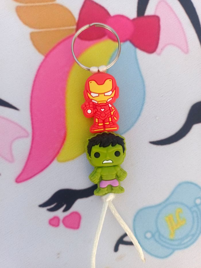 Un mini porte clés Marvel Iron Man et Hulk pour accrocher vos clefs en toute sécurité, composé de perles en silicone alimentaire et/ou bois naturel. 100% personnalisable, énormément de choix de clips, perles, etc… Envoyez-moi un message afin de créer main dans la main votre accessoire idéal. Une photo du prototype de celui-ci vous est envoyé pour validation avant envoi.