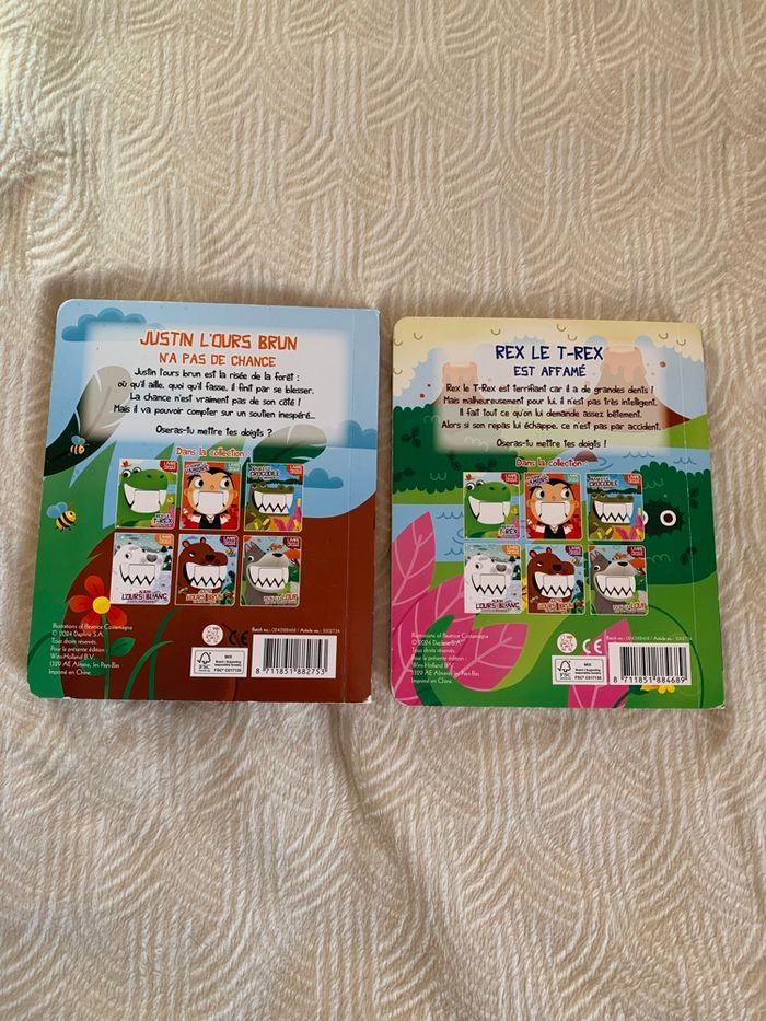 Lot de 2 livres enfants cartonnés, livres croque, Justin l’ours brun n’a pas de chance, Rex le T-Rex est affamé. En très bon état.