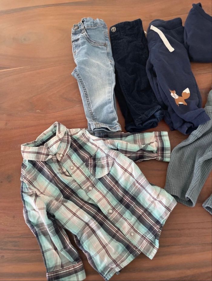 Lot de vêtements pour bébé garçon en 9M comprenant: - 1 jeans - 1 pantalon en velours - 1 jogging avec son sweat - 1 salopette - 1 chemise manche longue Tout est en très bon état, pas de taches Plusieurs marques différentes