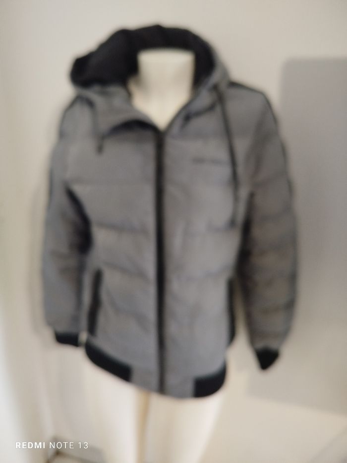 #kytieXShomme. Blouson a capuche taille XS en excellente état gris clair et noir poche intérieure a pression tien très chaud poche extérieure capuche non amovible de marque FSBN mesure des épaules et 42 cm des aisselles 50 cm hauteur 65 cm ref 098 ref 3F