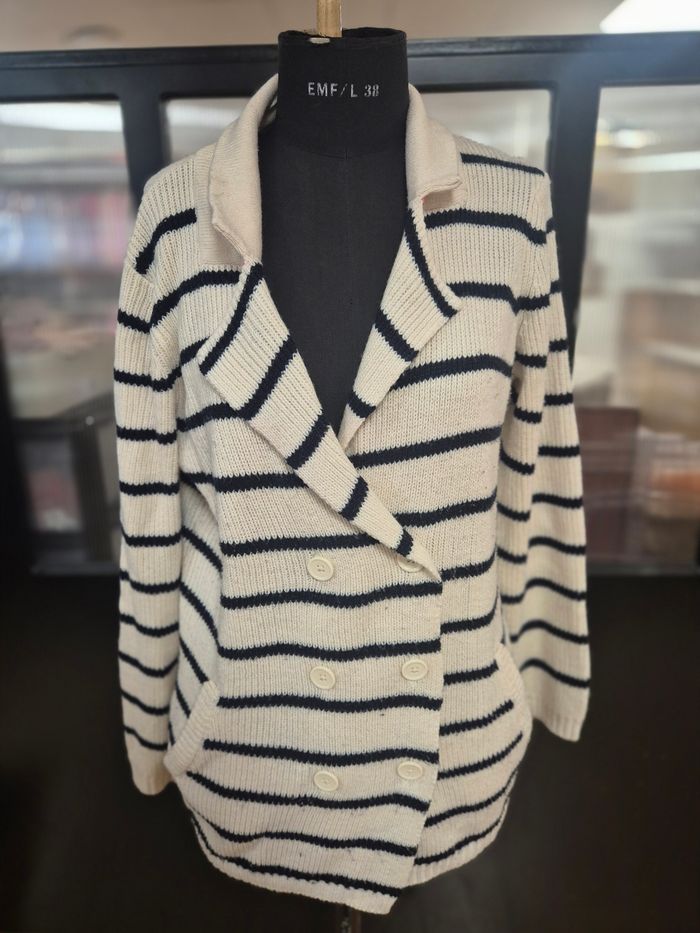 Gros gilet boutonné. Boutonnage croisé. Avec col à rabat. 2 poches devant. Manches longues. Effet marinière