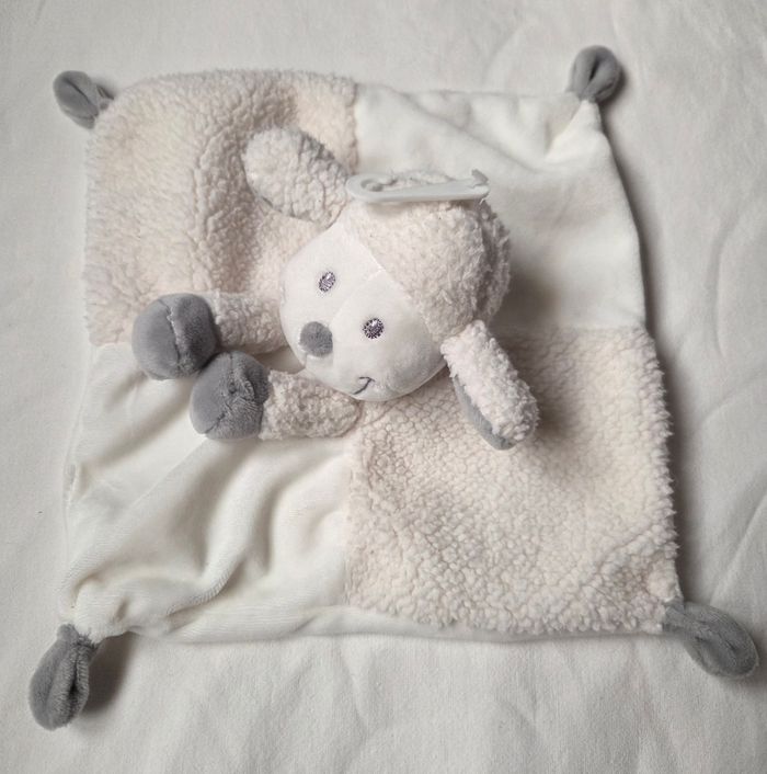 Doudou carré plat en velours de couleur blanc et en moumoute et de l'autre côté en velours de couleur blanc. Mouton sur le milieu du doudou. Intérieur des oreilles et bout des pattes en velours de couleur gris. Nœud en velours de couleur gris sur chaque coin du doudou.