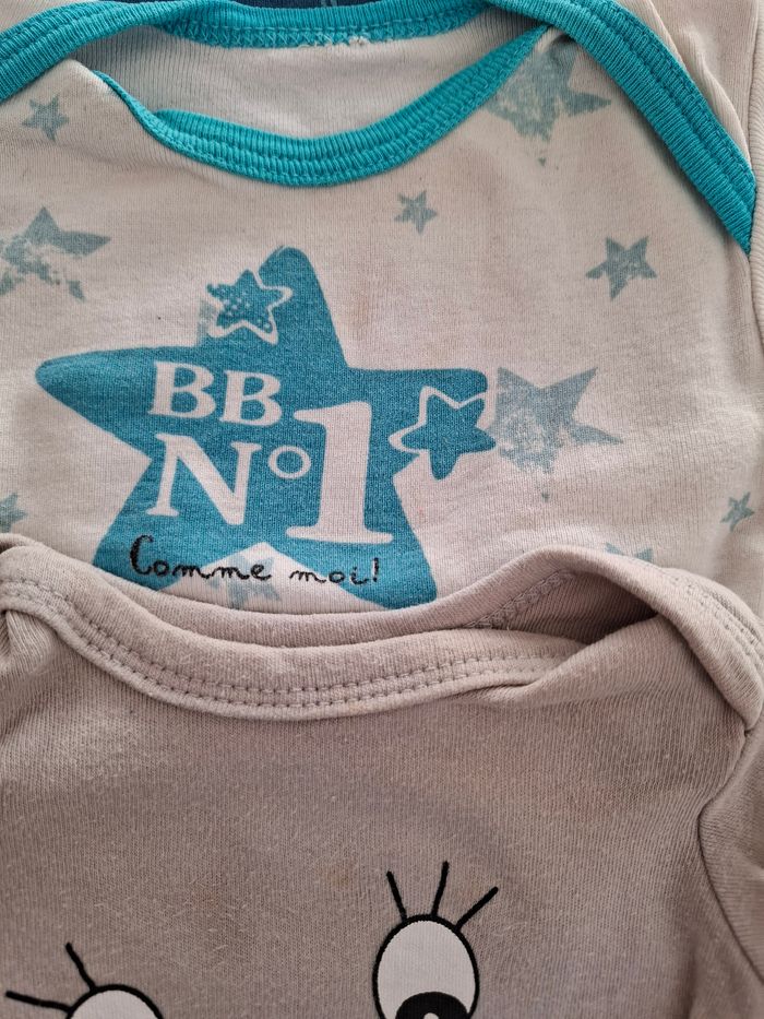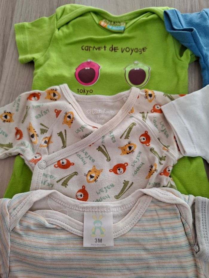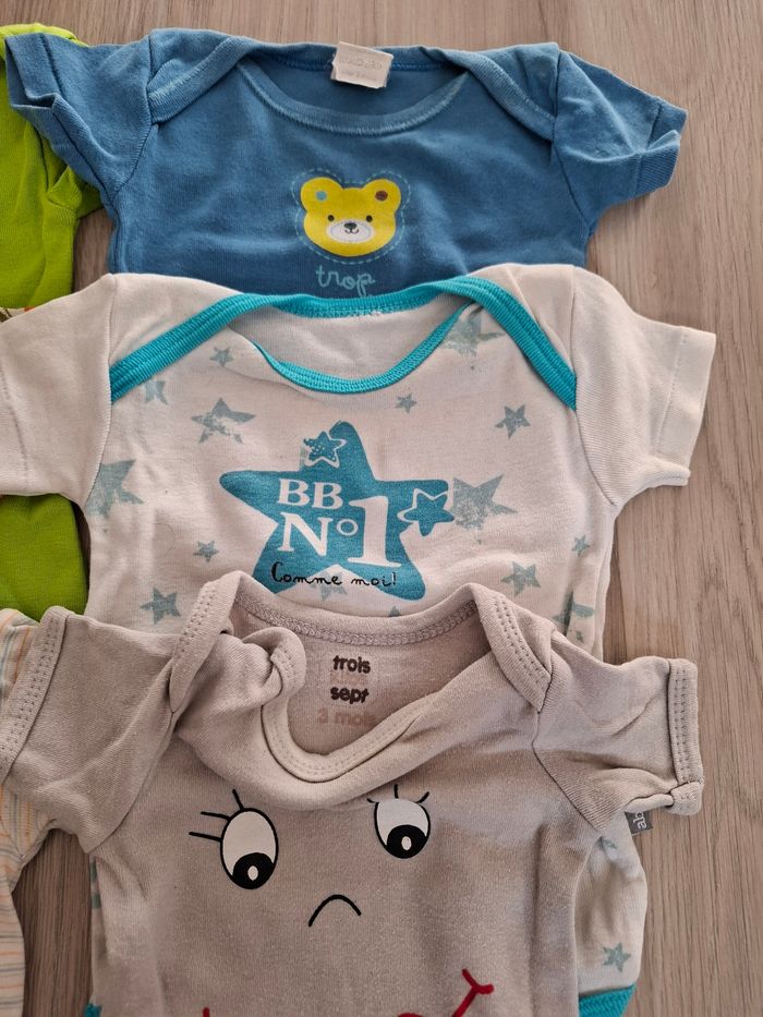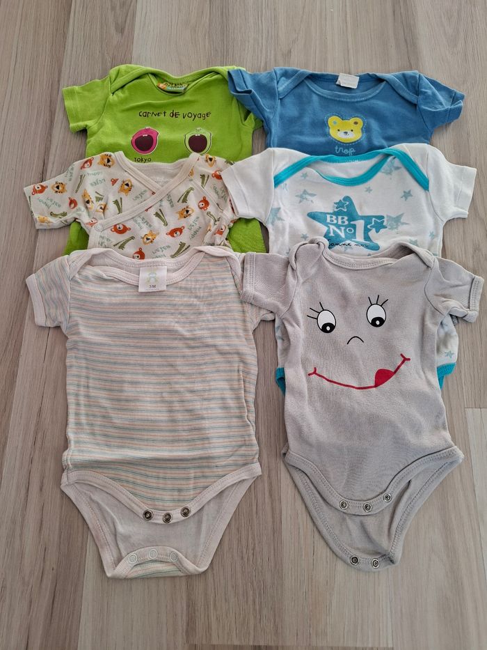 Vends 6 bodies manches courtes, différentes marques 2 bodies ont de légères petites tâches (voir dernière photo) Bon état Taille 3 mois