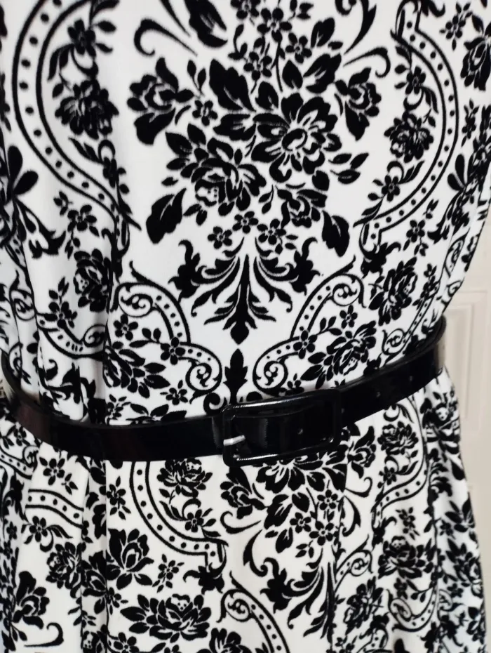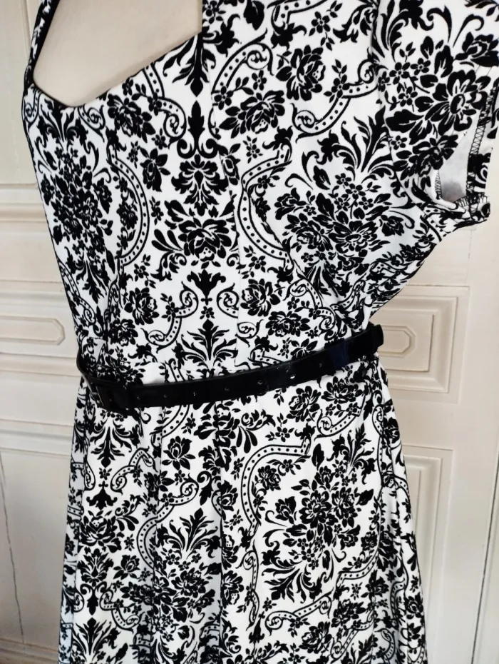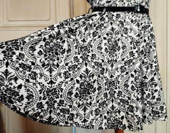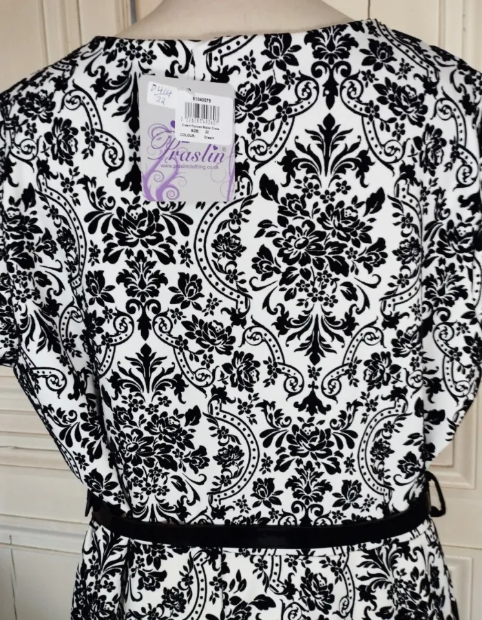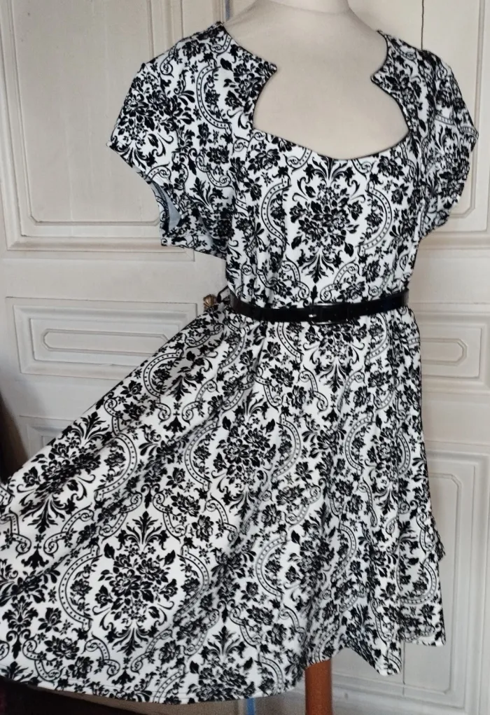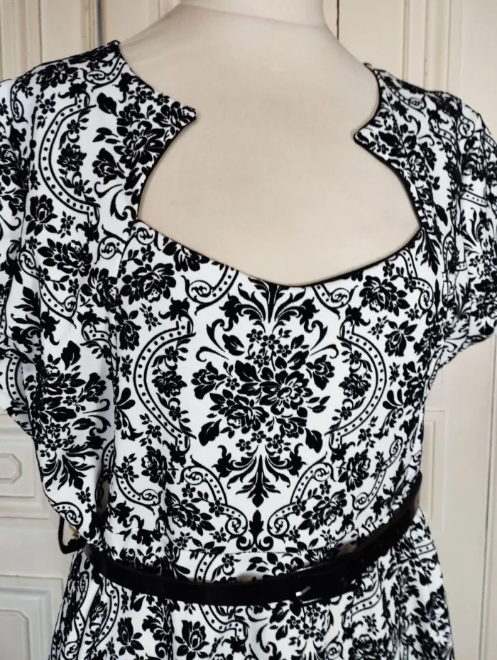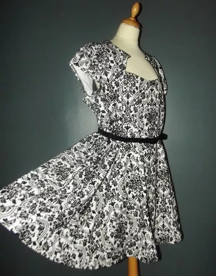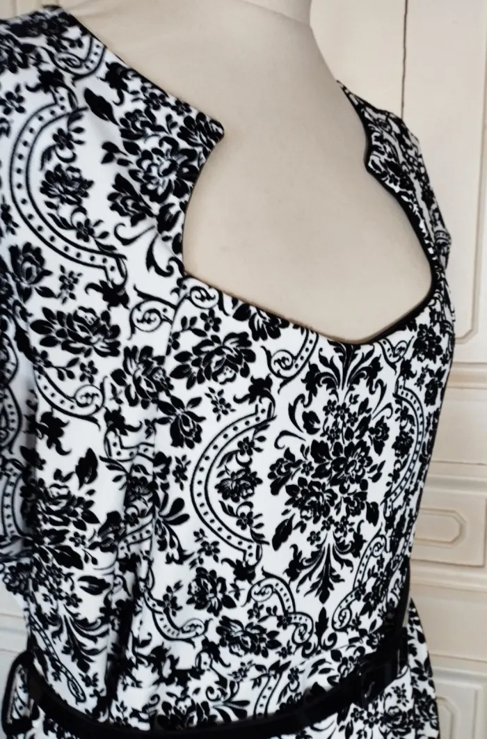 PRASLIN ROBE T UK 22 CORRESPOND A UN 52 VOIR MESURES DETAILLEES AU BAS MODELE RETRO FIFIES ULTRA FEMININ CONFORTABLE BIEN EXTENSIBLE TISSU SATINé CREME AVEC ARABESQUES BAROQUE FLORAL EN PANNE DE VELOURS NOIRE SEMI LOURD TOMBé IMPECCABLE COL RECTANGULAIRE OUVERTURE 25 CM PROFONDEUR 19 CM AVEC POINTES AMUSANTES REVENANT VERS LE DECOLLETTé A 7 CM DE HAUTEUR PETITES MANCHES 11 CM OUVERTURE CONFORTABLE TAILLE PLUTOT HAUTE ET LARGE MARQUéE AVEC LA JOLIE CEINTURE VERNIE NOIRE 108 CM SUR 2 DONNANT SUR UNE DECOUPE DE JUPE EN COROLLE AVEC PLIS DANSANTS ET AMPLITUDE AU BAS DE 330 CM INFROISSABLE TENUE IMPECCABLE TRES EXTENSIBLE 95% POLYESTER 5% ELASTHANE MESURES PRISES A PLAT PUIS EN ETIRANT RAISONNABLEMENT EPAULES 48 CM MANCHES 11 CM POITRINE 61 CM TAILLE HAUTE 59 CM TAILLE 65 CM BAS 165 CM AMPLITUDE 330 CM LONGUEUR 96 CM