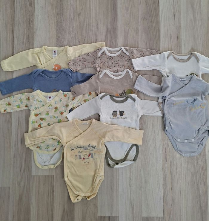 Vends 9 bodies manches longues, différentes marques. 1 bodie a une légère tâche (voir dernière photo) Taille 3 mois Bon état