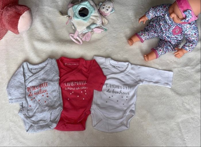 🌸 Lot de trois bodies en très bon état 🌸Taille 0 mois 🌸 croisé avec ouverture sur le devant 🌸 Maison, non-fumeur et les adaptées au bébé
