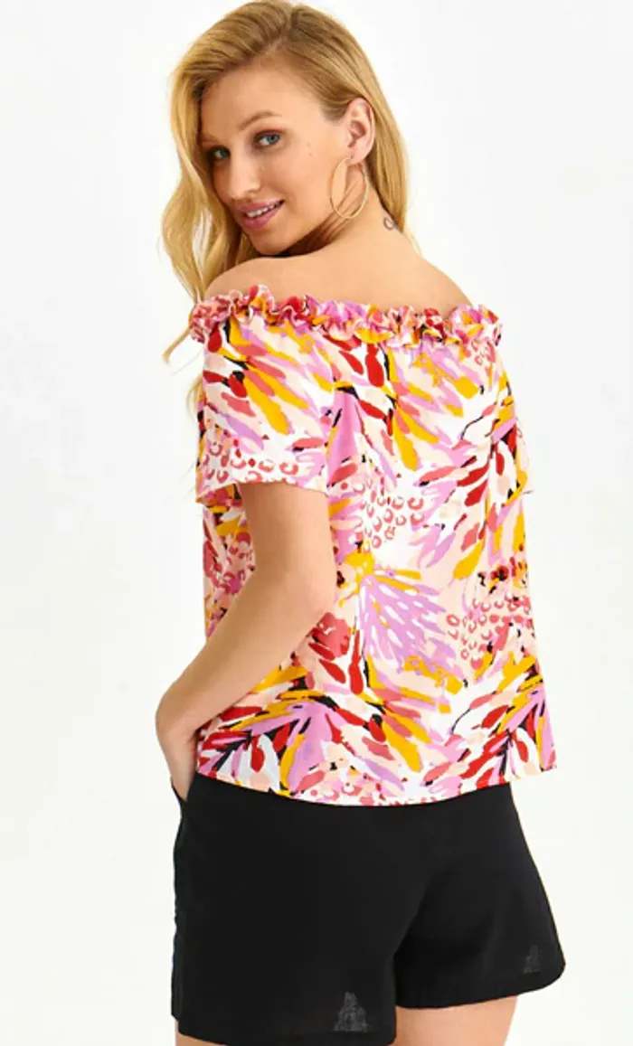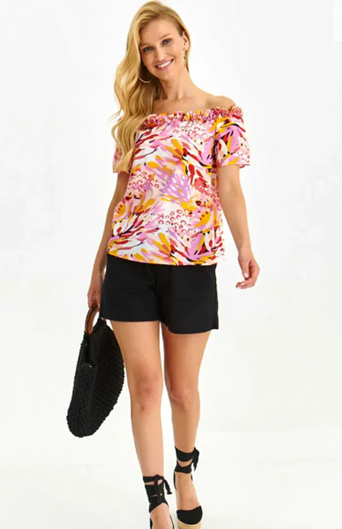Chemisier Top Secret pour femme à l'imprimé saisissant. Léger, ce chemisier des manches courtes et des épaules dénudées. Il est orné de fronces remarquables sur le haut et rehaussé d'un joli imprimé végétal. Confectionné en maille douce et résistante, il s'accorde parfaitement avec toutes les tenues féminines d'été et de vacances. 100% polyester