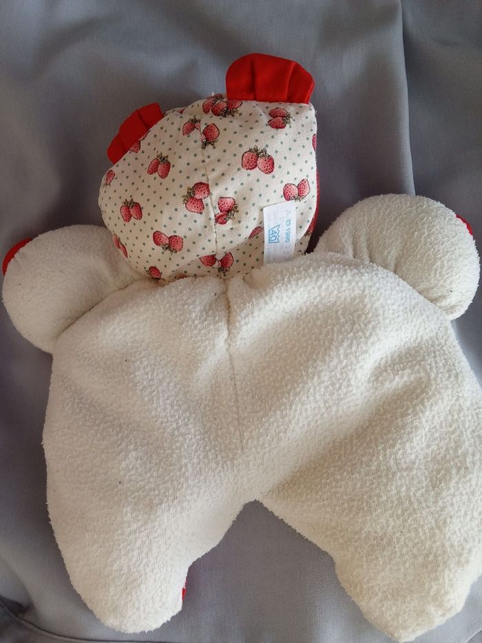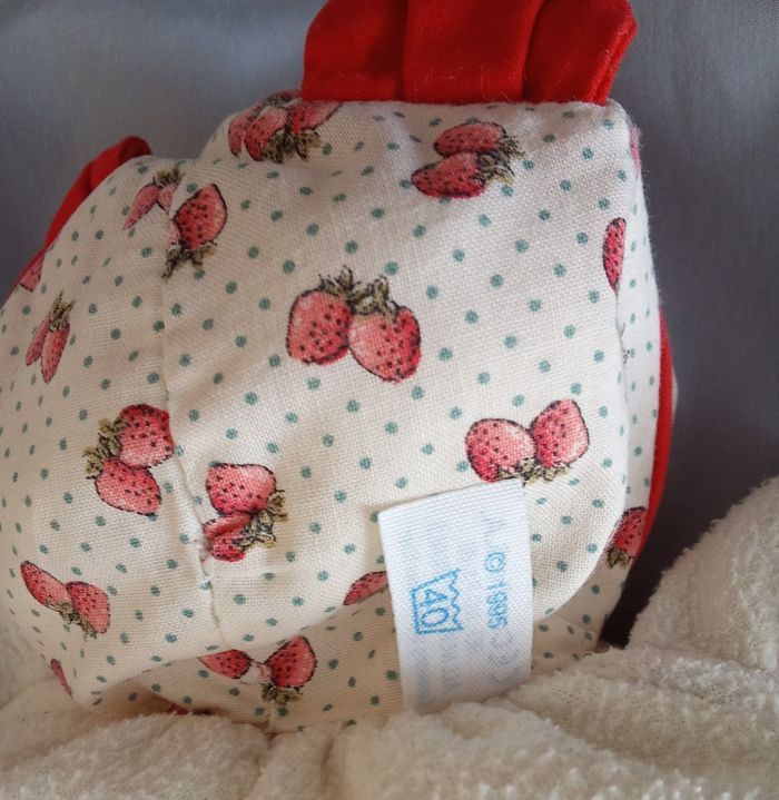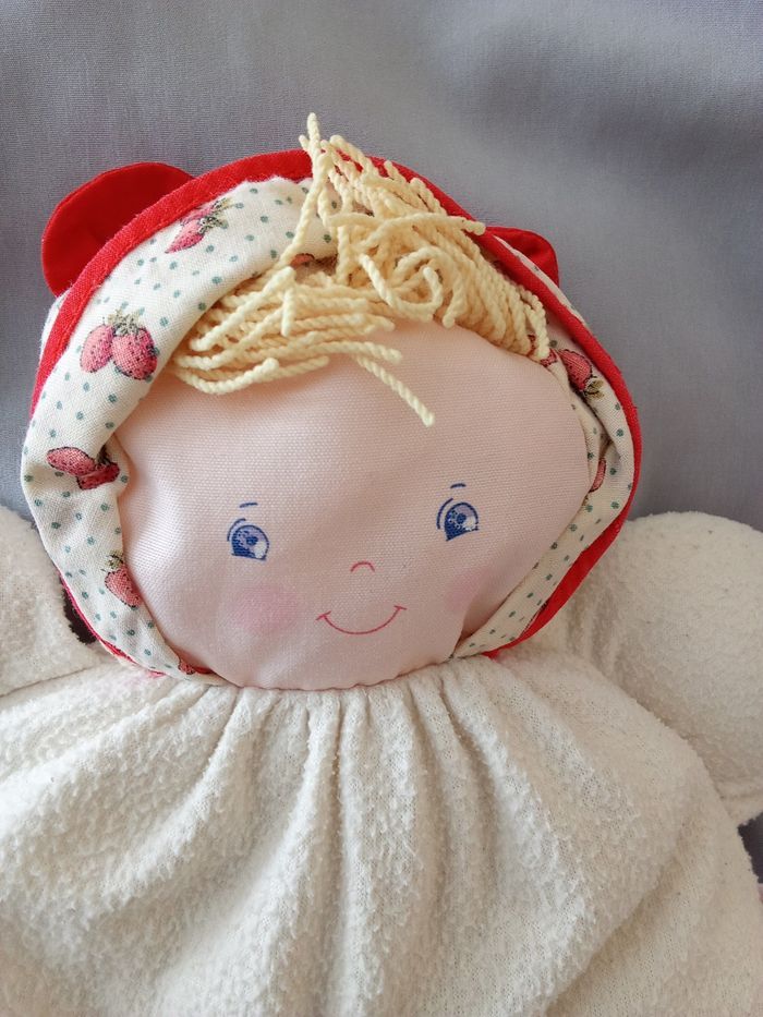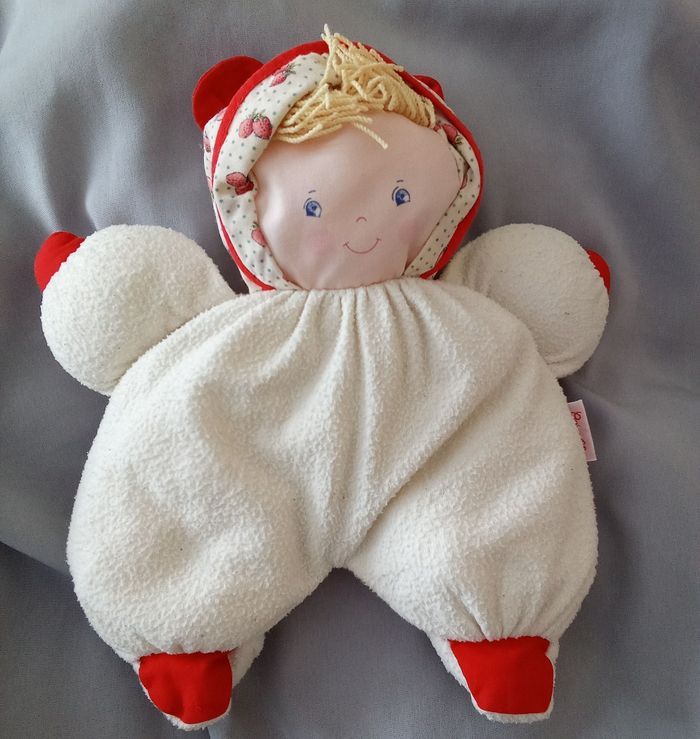usure d'utilisation il est d'occasion et il n'a plus son col doudou peluche de la marque Corolle de 1995 poupée chiffon tissu visage peint yeux bleus tissu imprimé de fraises / fraise pareil charlotte aux fraises date de 1995 corps tissu polaire blanc crème dessus pieds rouge bonnet imprimé fraises cheveux laine blonds jaunes ficelle son nom élastidoux étiquette nuque présente en photo prix 45€ hors port et en annonce c'est disponible