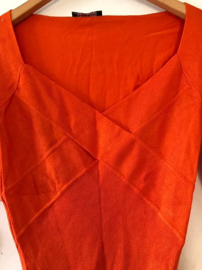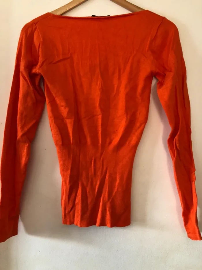 Haut fin et élégant, à la coupe près du corps, mettant joliment la silhouette en valeur. Coloris orange vif, lumineux et tendance. Encolure cache-cœur en V croisé sur le devant, avec jeux de découpes structurantes qui soulignent la poitrine et la taille. Manches longues, finition soignée, maille douce et fluide avec une belle tenue. Dos sobre et ajusté. Idéal porté seul ou sous une veste, aussi bien pour une tenue habillée que casual chic. État comme neuf, aucune usure visible.