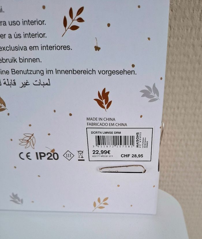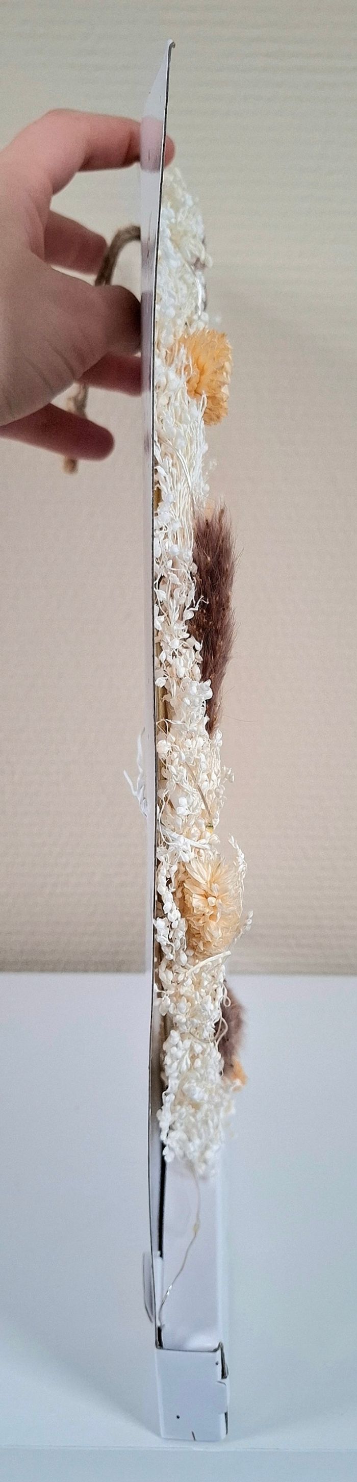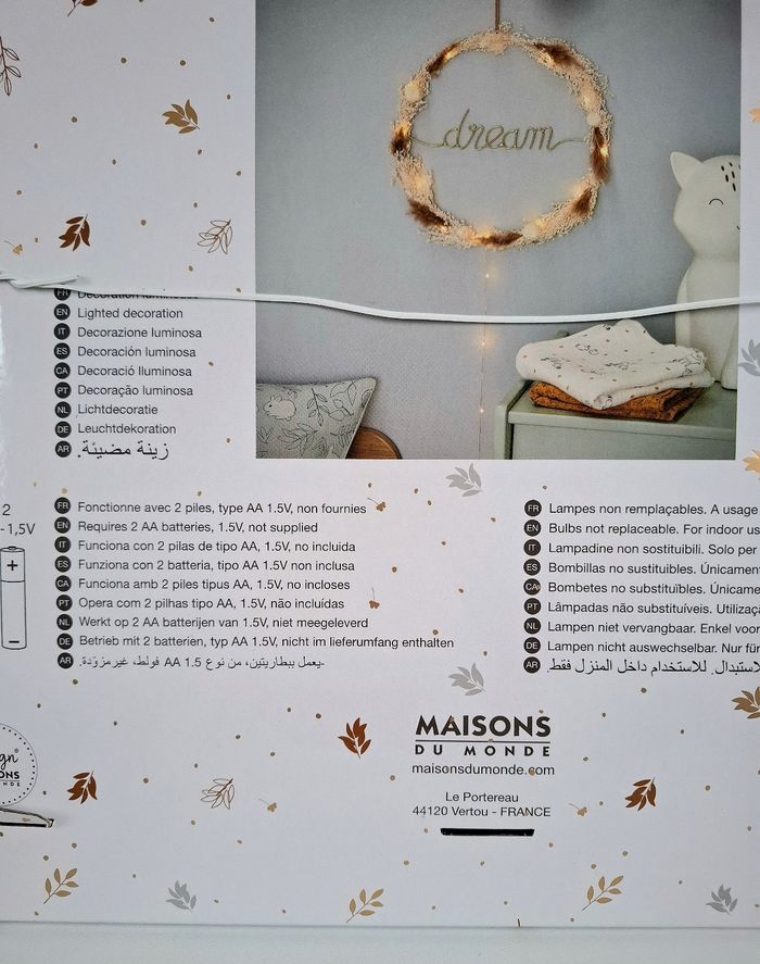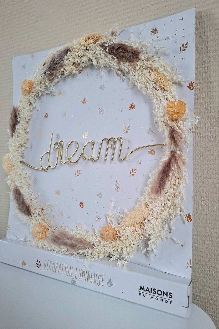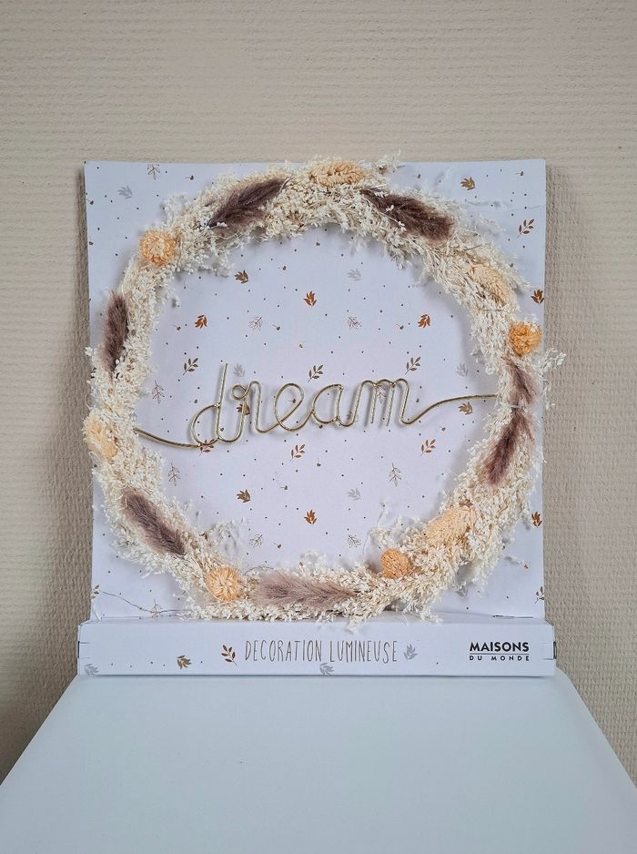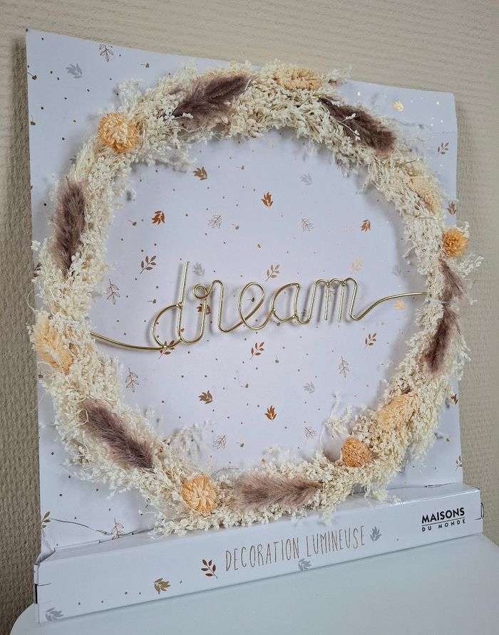 Je vends une décoration lumineuse à suspendre avec une couronne de fleurs séchées et le mot "Dream" au milieu venant de chez Maison Du Monde. La décoration est suspendue à l'aire un morceau de corde (voir photo). Dimensions : 33 cm de hauteur et 32 cm de longueur. Prix neuf : 22,99€. Neuf, encore emballer.
