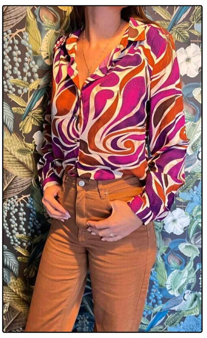 Chemisier femme Tons brun, beige et aubergine. 100 % viscose, tissu fluide et agréable.