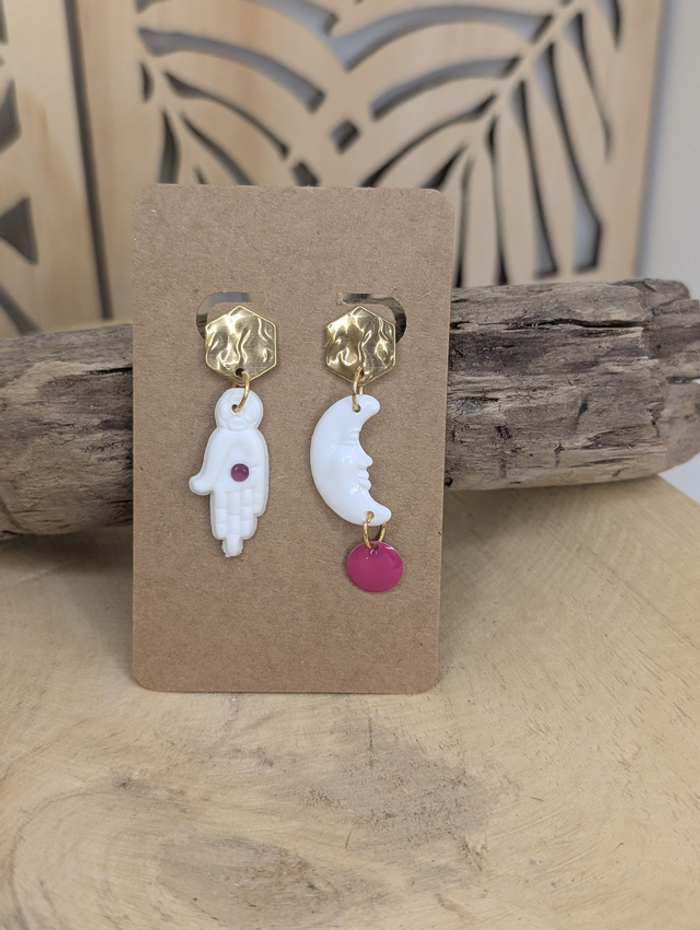 Boucles d’oreilles “Charmed” 🌙🔮 Plongez dans un univers mystique et féerique avec les BO “Charmed” : Faites de fèves vintage représentant une lune et une main de voyante, délicatement ornées d’une tourmaline rose... Montées sur acier inoxydable, elles captent la lumière et la magie, pour un bijou ensorcelant et unique...