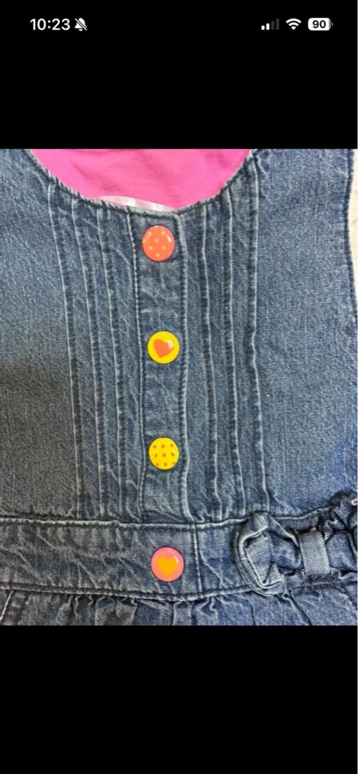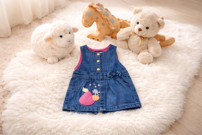 Adorable robe en jean bleu de la marque Graine de Rêve, taille 12 mois. Joli motif fraise qui apporte une touche douce et estivale 🍓