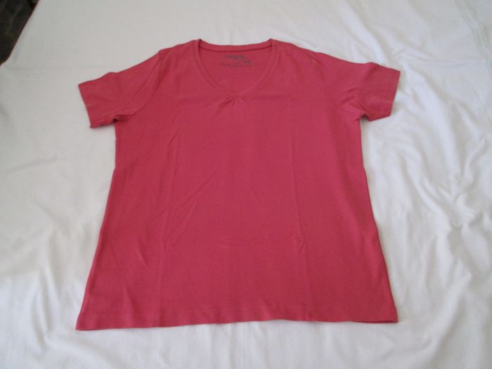 Vends tee-shirt Fashion Plus rose à col V. 100 % coton. Taille 48/50. Très bon état, porté une fois. N'hésitez pas à consulter mes autres annonces.