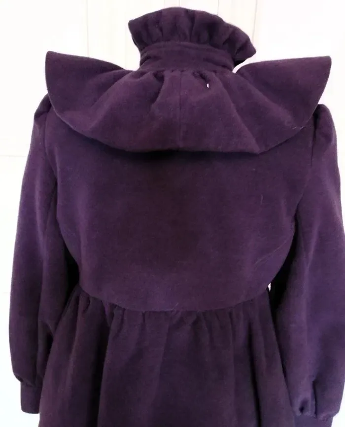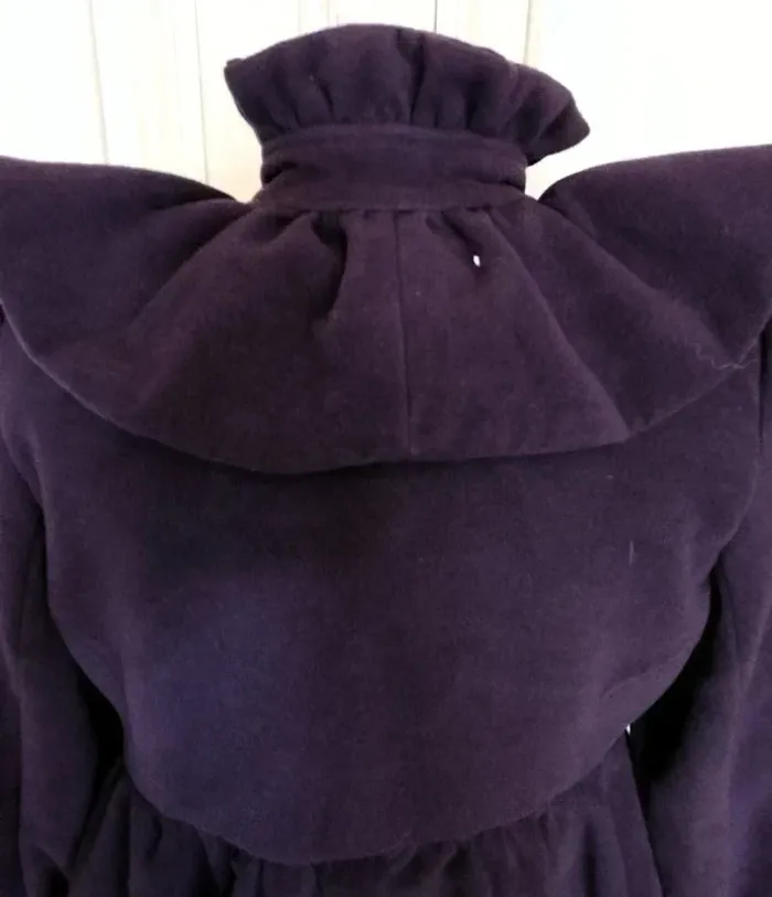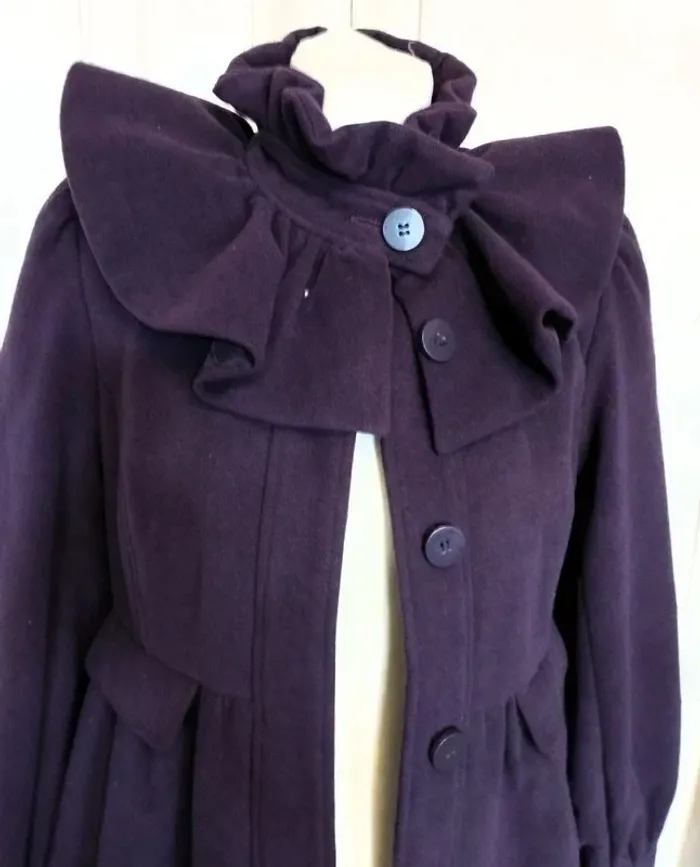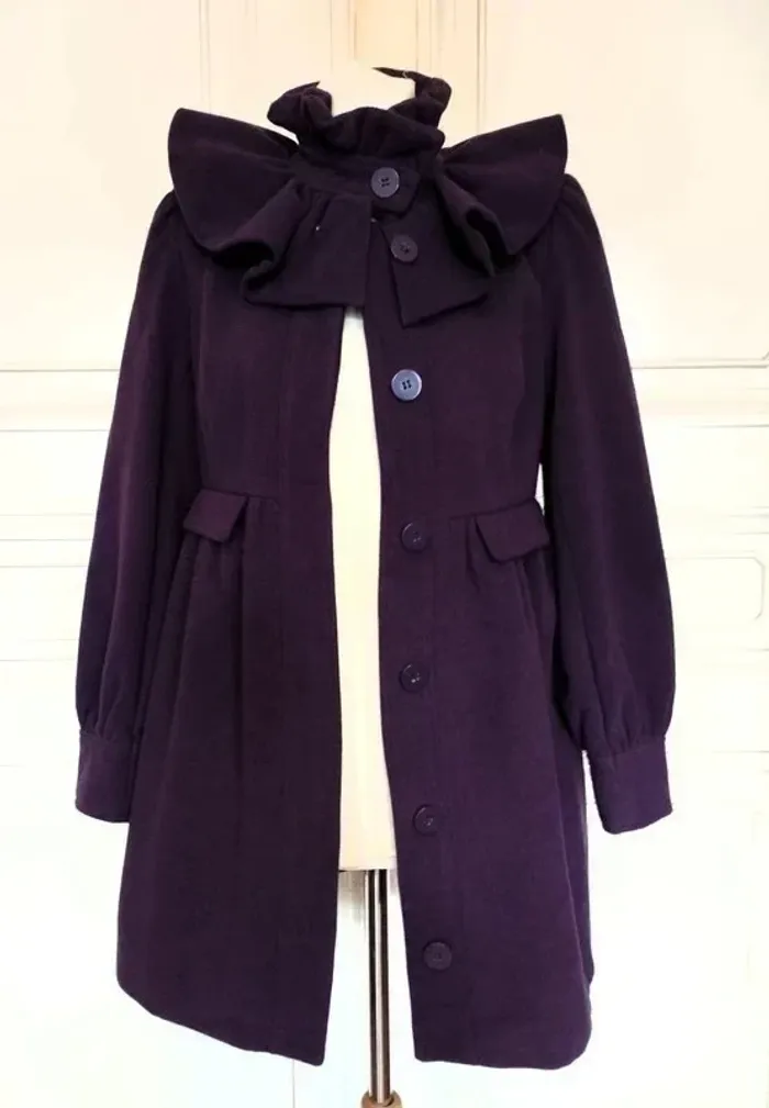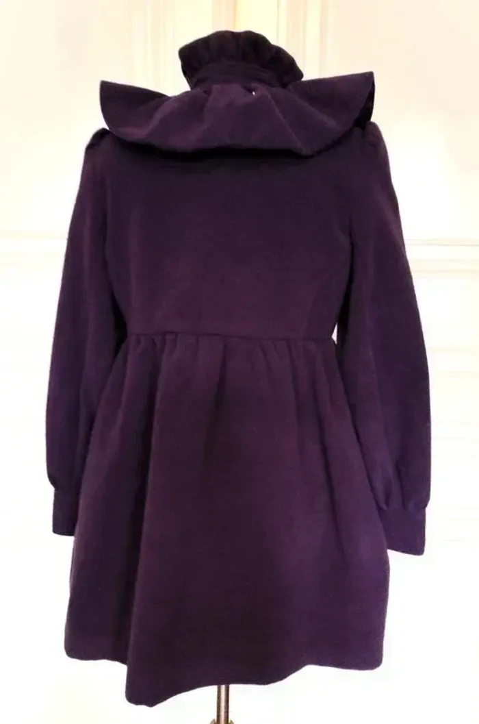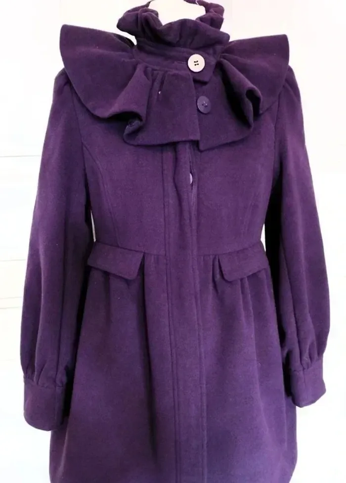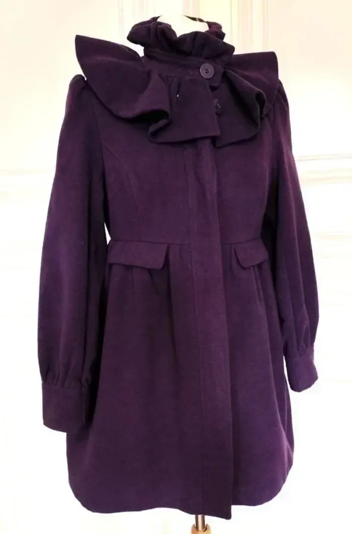 MISS REAL MANTEAU T UK 10 CORRESPOND A UN 38/40 VOIR MESURES AU BAS MODELE TRENDY FEMININ LAINE GOLDEN PRUNE DOUCE ET LEGERE COL TULIPE AVEC REBORD MONTANT 9 CM HAUTEUR FRONCé COMME EN CRENOLINE AVEC A MI HAUTEUR BANDE PLATE DONNANT SUR PATTE A BOUTONNER MINI CAPE EN COROLLE FRONCée SUR LES EPAULES DE 12 CM DE HAUTEUR FERMETURE 7 GROS BOUTONS PRUNE DONT UN POUR LE COL ET LES SUIVANTS DISSIMULés SOUS PATTE MINI FRONCES SUR LE DESSUS D EPAULE CREANT UN JOLI REBONDI MANCHES CONFORTABLES AVEC AU BAS MINI FRONCES PRECEDANT UN BANDEAU RESSERé DE 8 CM DE HAUTEUR DECOUPES EN BIAIS SUR LE BUSTE TAILLE MARQUEE PAR DECOUPE AVEC MINI FRONCES DONNANT UN PETIT EFFET BALLOON AU BAS DU MANTEAU FAUSSE POCHE AVEC RABAT 12 CM SUR 4 SOUS TAILLE DEVANT FACE INTERNE SATINée PRUNE NON EXTENSIBLE EPAULES 37 CM POITRINE 46 CM TAILLE 42 CM HANCHES 58 CM BAS 69 CM MANCHES 65 CM LONGUEUR 82 CM