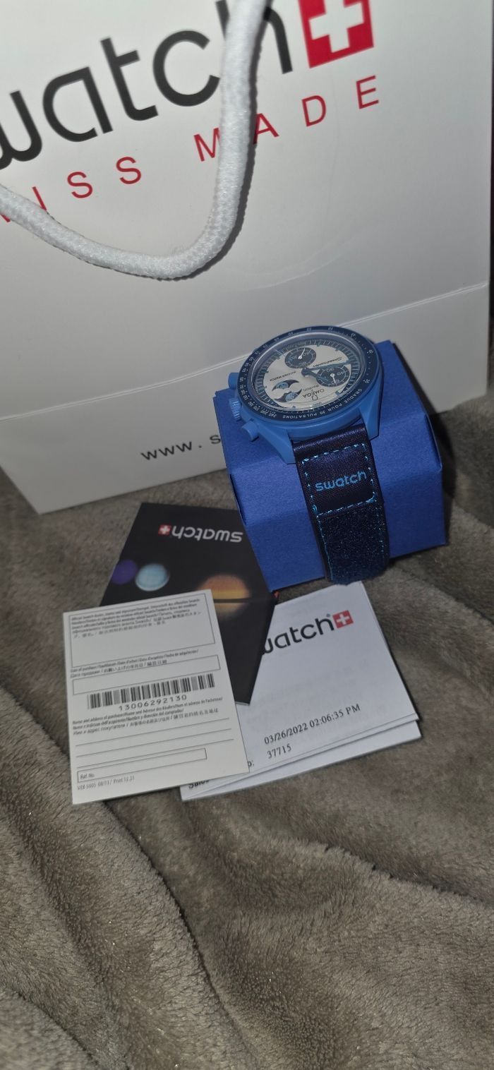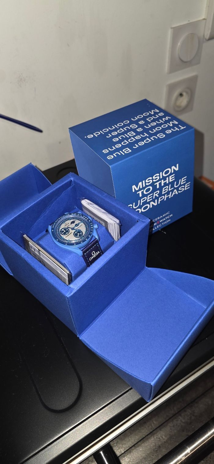 Montre Omega X Swatch modele mission to blue moon, porté 2 ou 3 fois lors de certaines occasion, sinon etat parfait aucune rayure ni defaut