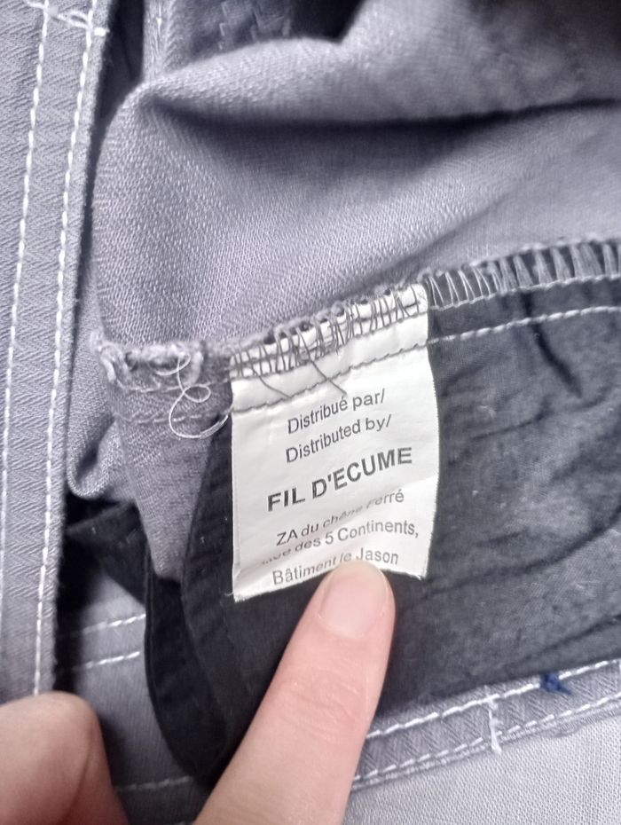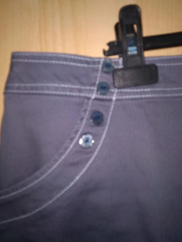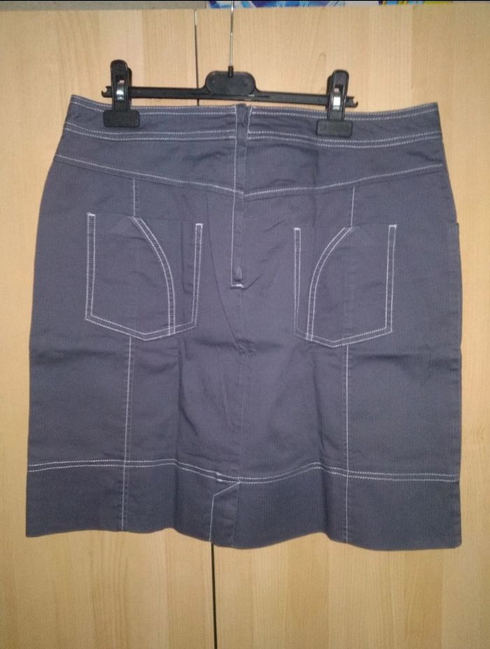 Jupe grise avec surpiqures blanches. Légèrement élastique. Pas d'étiquette de taille mais doit correspondre à un 42. Longueur : 51 cm. Largeur hanches : 51 cm. Largeur taille : 41 cm. Marque : Fil d'écume. Etat impeccable