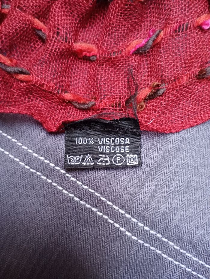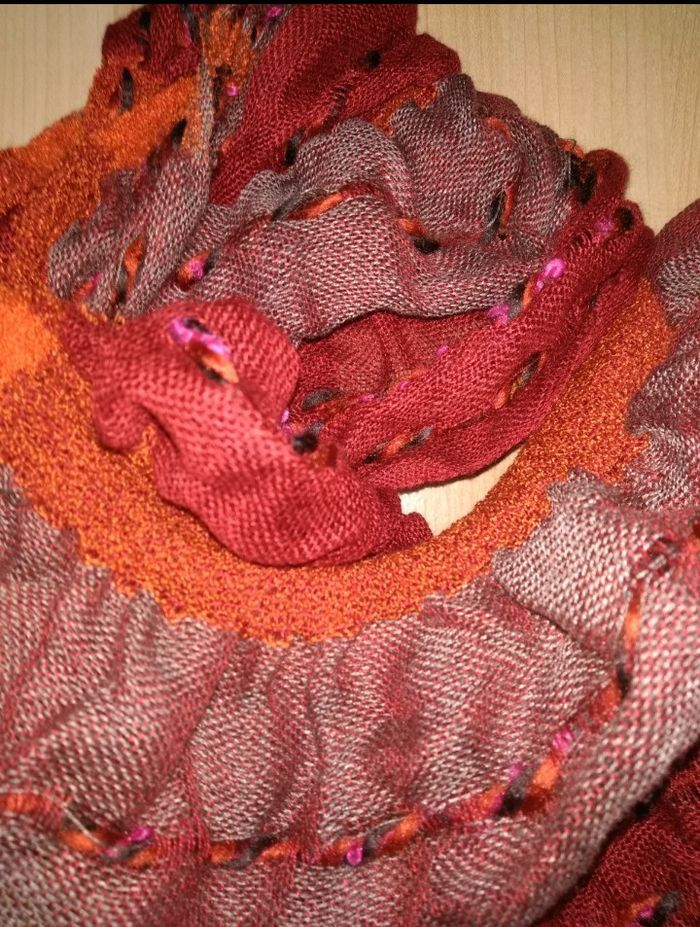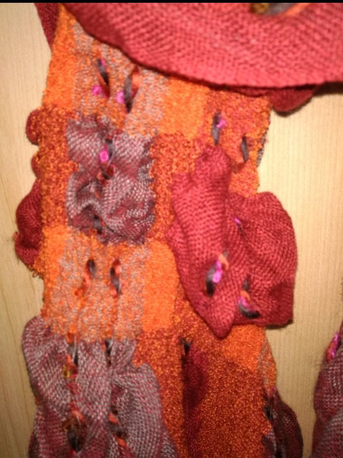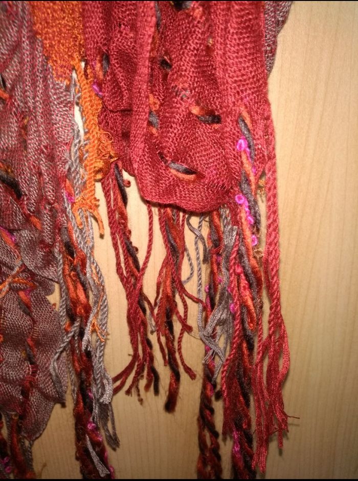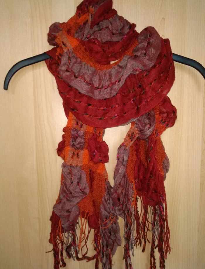 Echarpe torsadé avec franges. Tons orangés. Longueur : environ 180 cm. Très bon état.