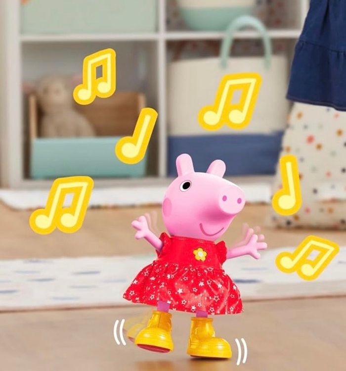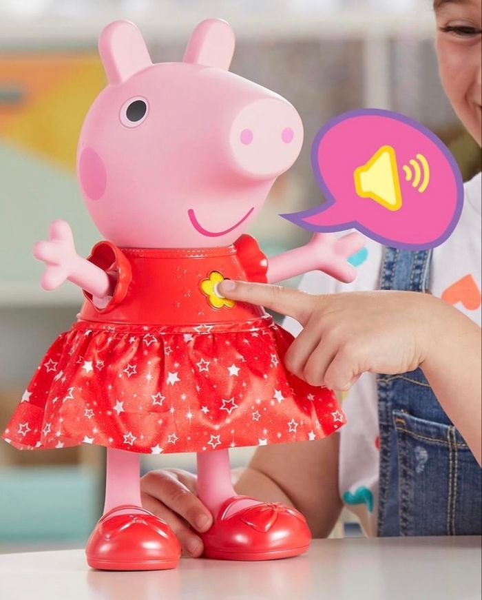 POUPÉE PEPPA PIG INTERACTIVE : Les enfants parlent, jouent, dansent et font la fête avec Peppa ! Cette poupée mesure 30 cm de haut et porte une robe festive scintillante. De plus, ses bottes de pluie jaunes amovibles changent sa façon de jouer. Piles incluses PLUS DE 55 SONS ET RÉACTIONS : Avec plus de 55 sons, phrases et réactions, ce jouet interactif offre plusieurs façons différentes de jouer LES BOTTES CHANGENT LE JEU : On met ou on enlève les bottes pour découvrir toutes les phrases, les effets sonores, les chansons et les jeux MODE FESTIF : Sans les bottes, le jouet est en mode festif. On appuie sur le bouton sur la robe de la poupée pour entendre des phrases et des sons festifs, la chanson thème de Peppa Pig et un jeu d'imitation MODE FLAQUES DE BOUE : Avec ses bottes, le jouet est en mode flaques de boue. On appuie sur le bouton pour des effets sonores thématiques, des phrases, un extrait de la chanson sur les flaques de boue et le jeu de la Statue musicale des flaques de boue