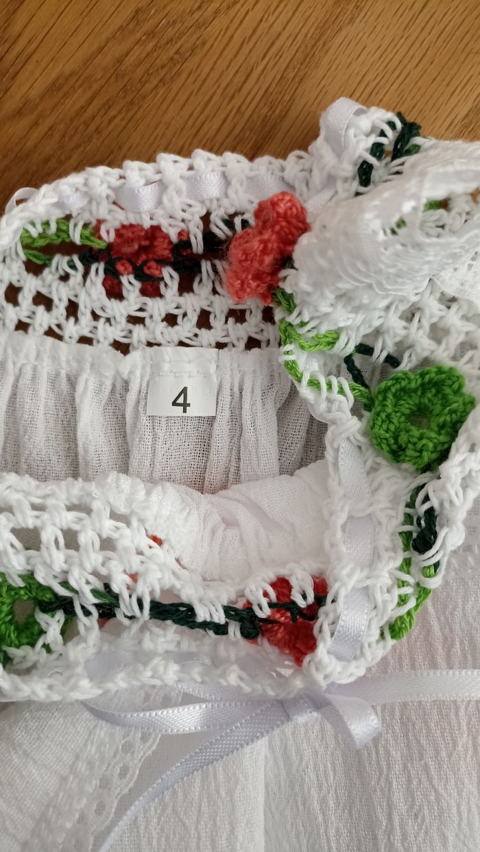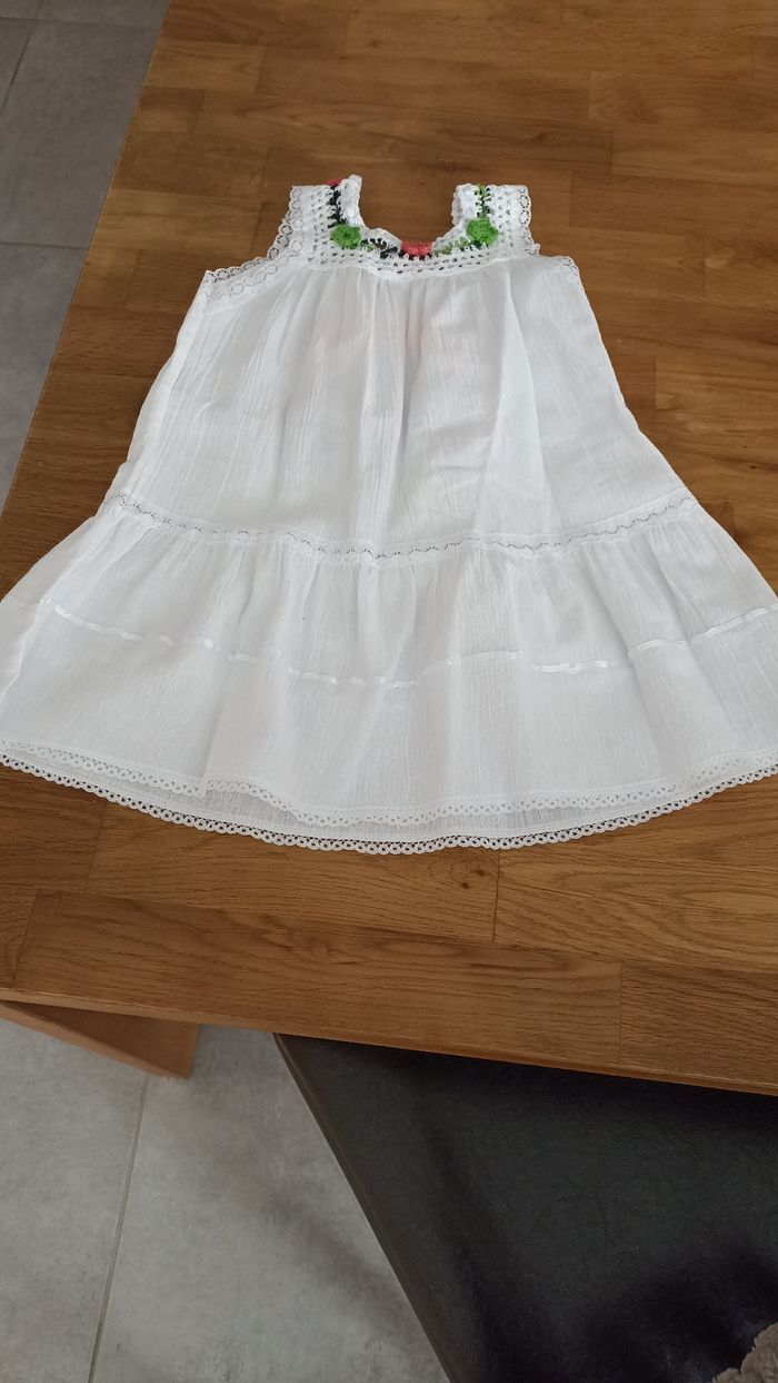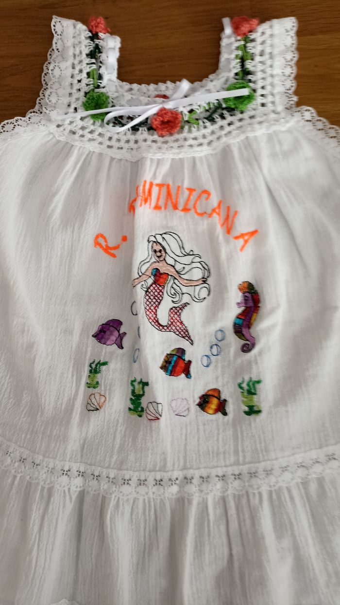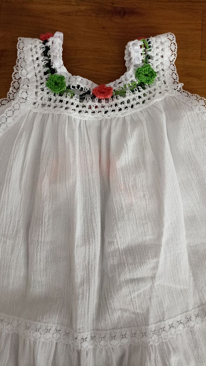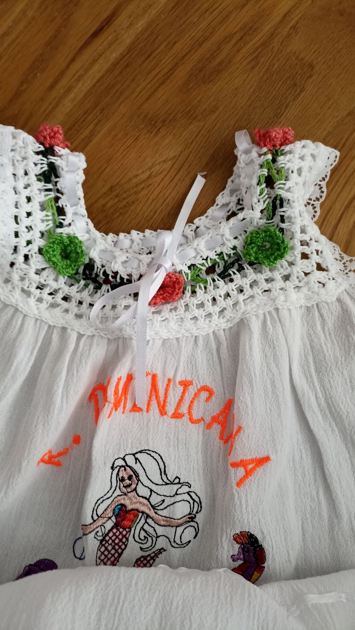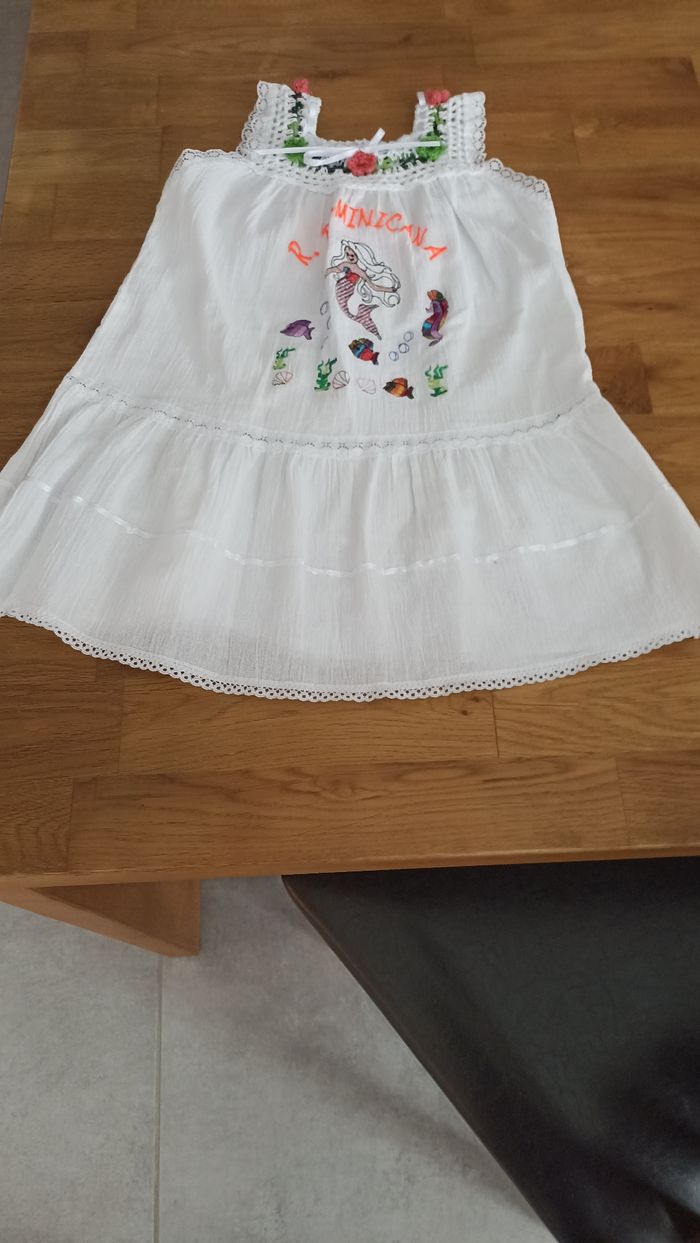 Robe neuve A été acheté en république dominicaine pour enfant de 6 ans mais cette robe correspondant à la taille d'une enfant de 4 ans . Très belle robe en coton.