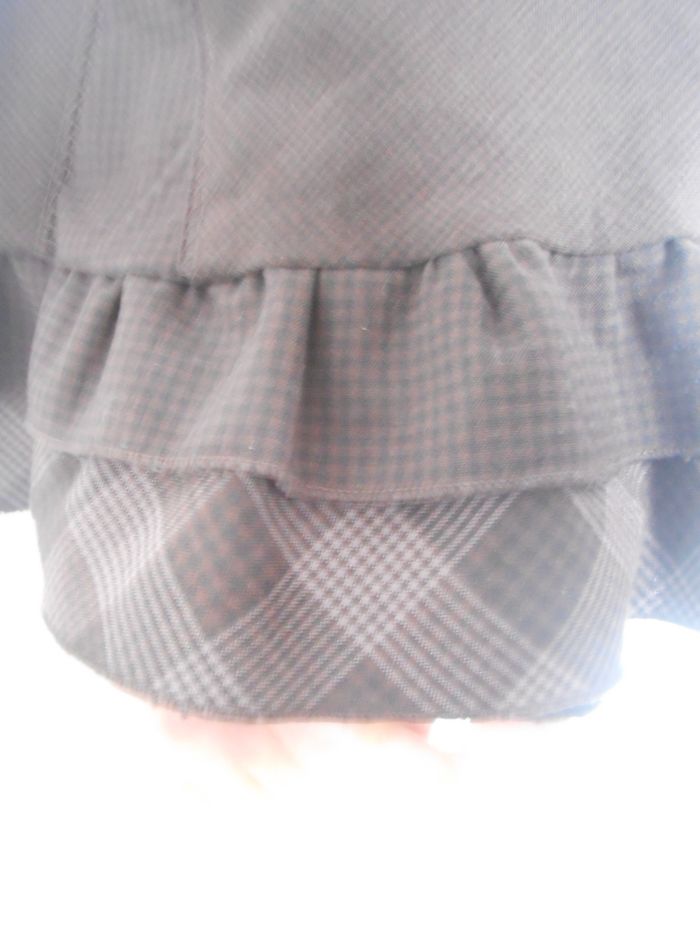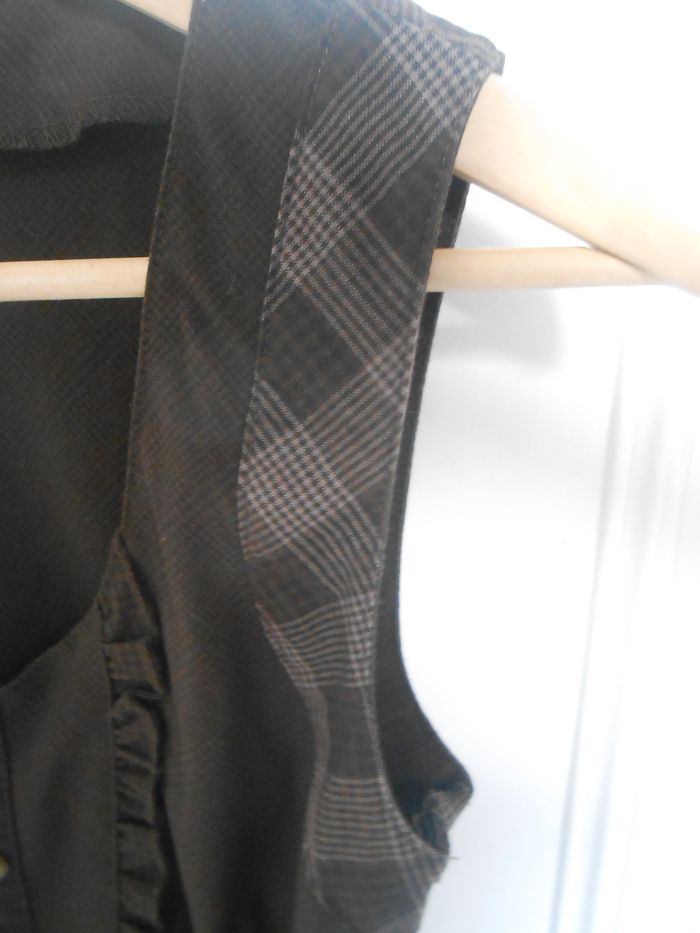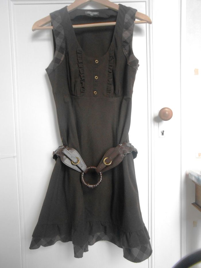 Robe marron vendue AVEC ceinture. Epaules et bas de la robe à motifs carreaux (voir photos). Très bon état. Longueur 86 cm.