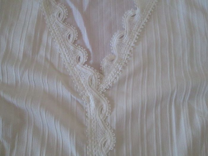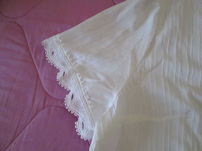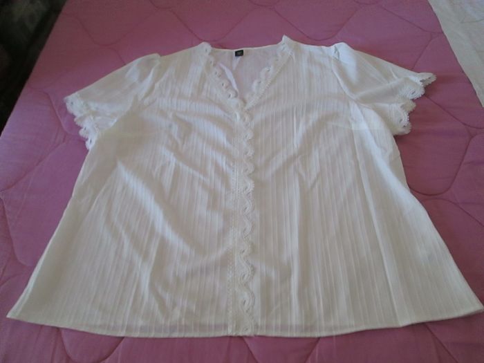 Vends haut blanc léger avec dentelle aux manches, au sol et devant. 100 % polyester. Taille XXXL. Neuf, jamais porté. N'hésitez pas à consulter mes autres annonces.