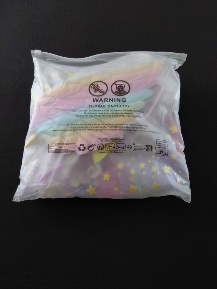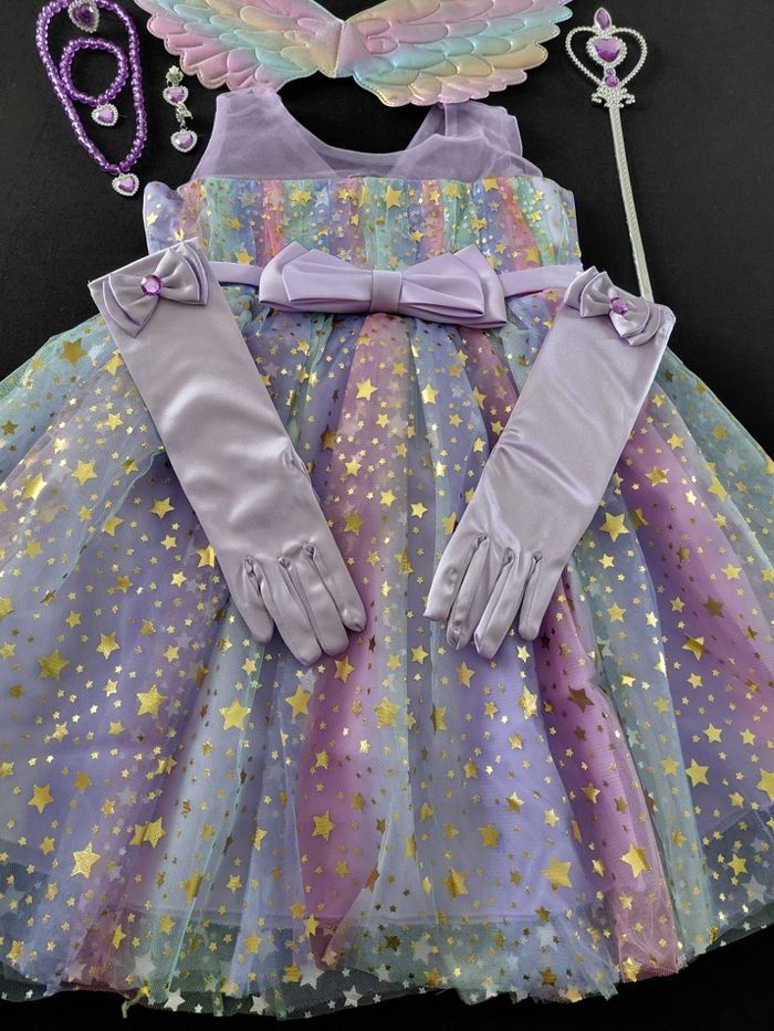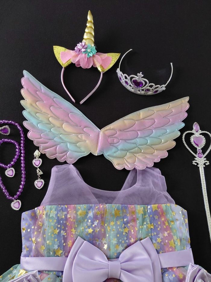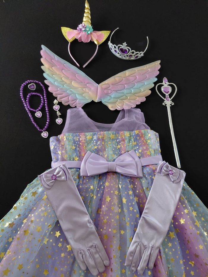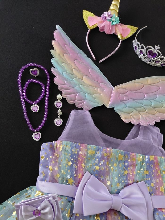 Déguisement robe princesse licorne violette paillette et ces accessoires (gants, baguette, couronne, bijoux, ailes et serre tête). La robe mesure 55cm de longueur, la taille convient aux petites filles de 3-4ans. Totalement neuve, vendue dans son emballage d’origine. Expédition rapide après votre commande