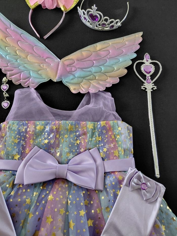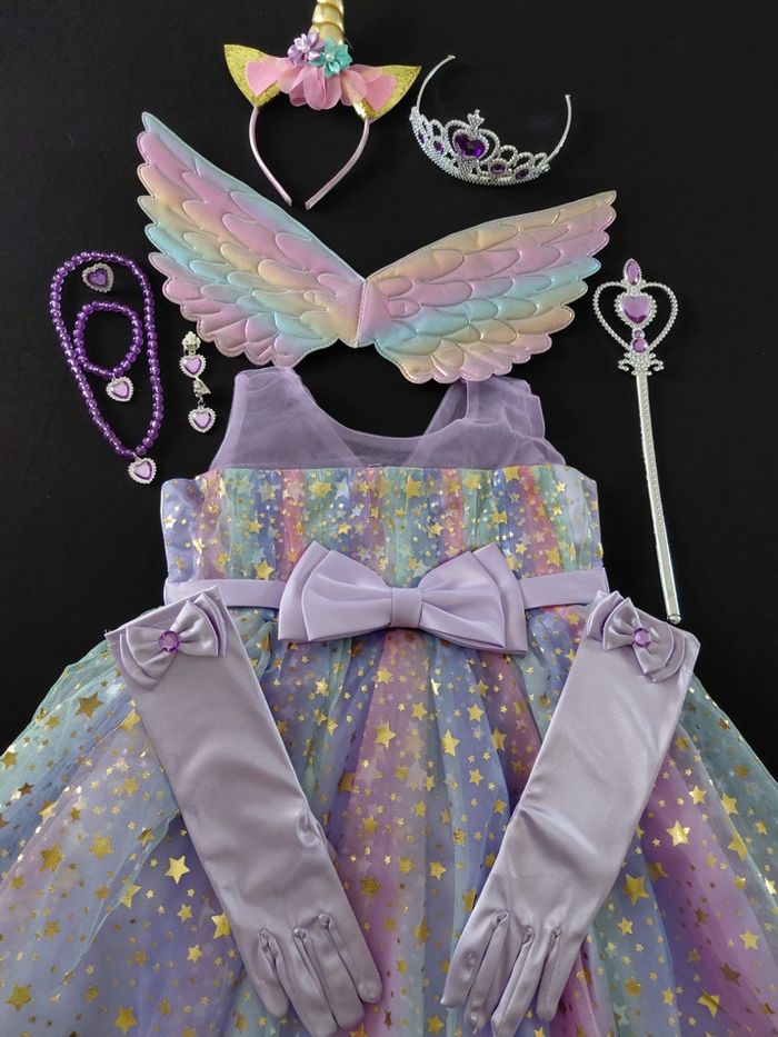 Déguisement robe princesse licorne violette paillette et ces accessoires (gants, baguette, couronne, bijoux, ailes et serre tête). La robe mesure 65cm de longueur, la taille convient aux petites filles de 4-5ans. Totalement neuve, vendue dans son emballage d’origine. Expédition rapide après votre commande