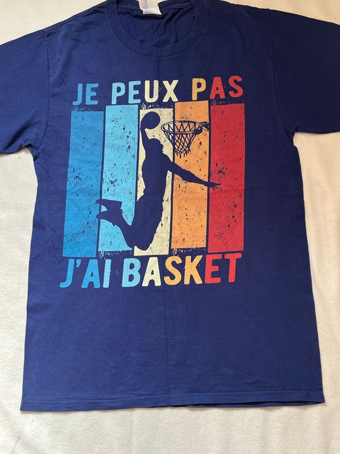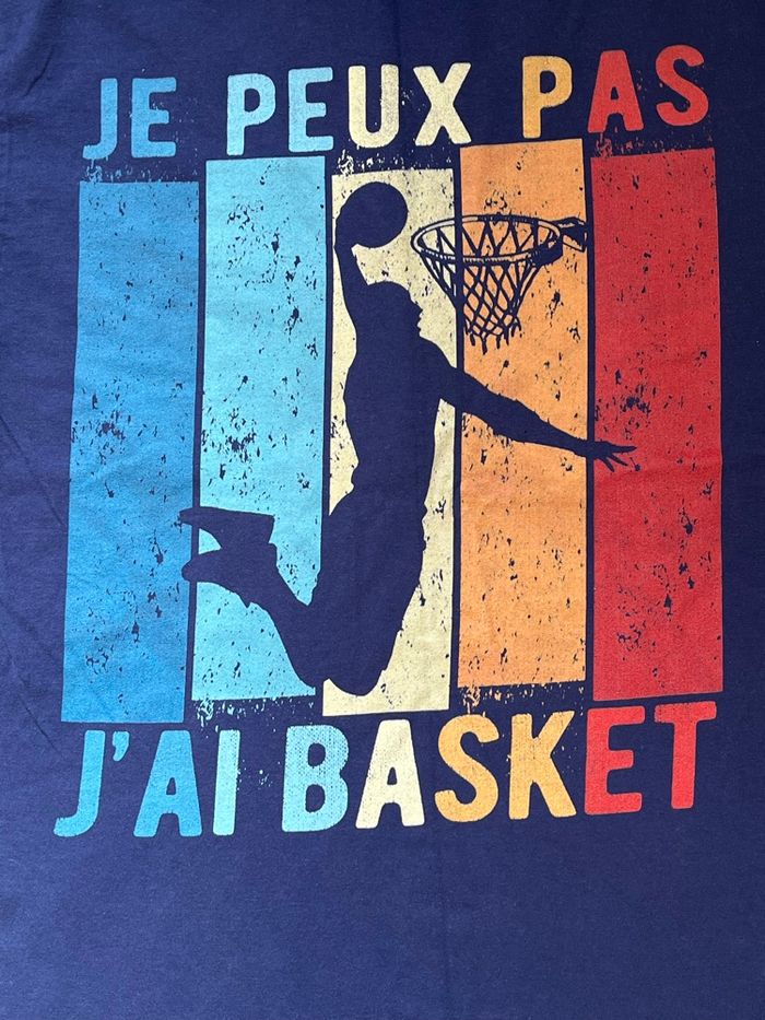 vend ce T-shirt manches courtes couleur bleue taille S motif basketteur au panier sur l’avant multicolore Écriture je peux pas j’ai basket demi largeur aux aisselles 43 cm longueur 67 cm 10 euros Mes autres annonces de vêtement pour homme ou femme de XS à S ou 12 à 14 ans #lma42femmeS #lma42femmeXS #lma42femmeXXS #lma42hommeS #lma42hommeXS #lma42garcon14 #lma42garcon13 #lma42garcon12 #lma42fille14 #lma42fille13 #lma42fille12