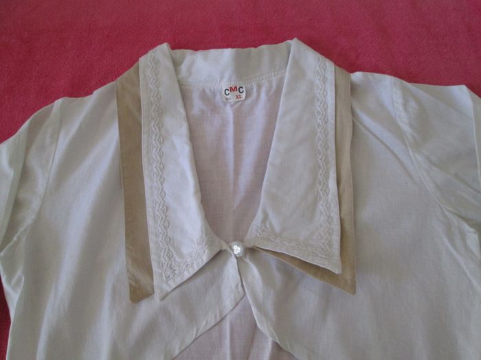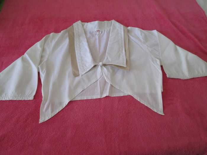 Vends boléro blanc cassé 100 % lin. Sous-col écru. Galon autour du col, aux poignets et en bas. Taille XL. Excellent état, très peu porté. N'hésitez pas à consulter mes autres annonces.