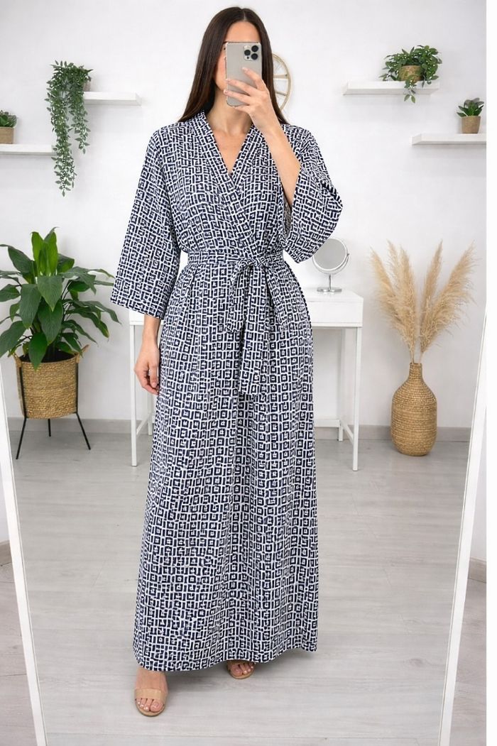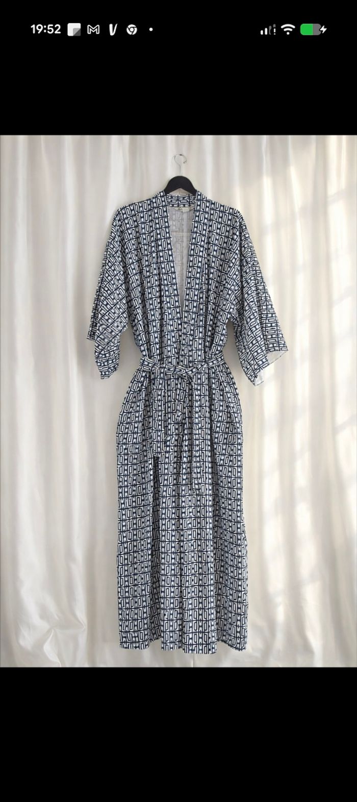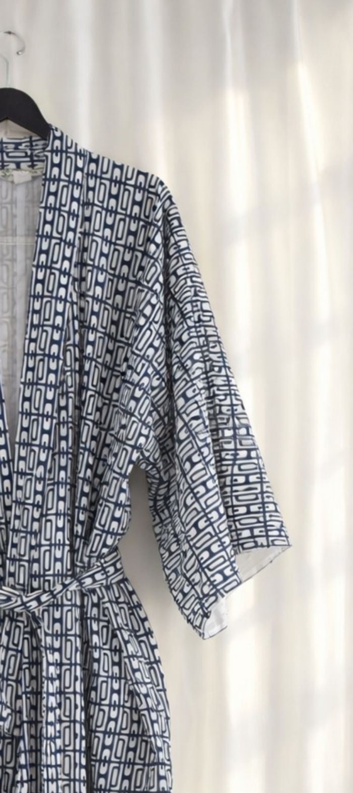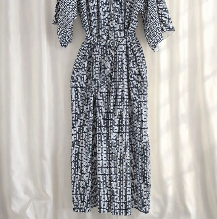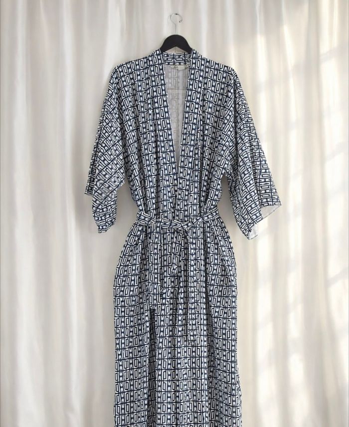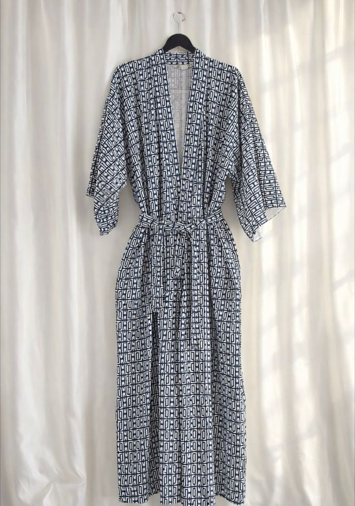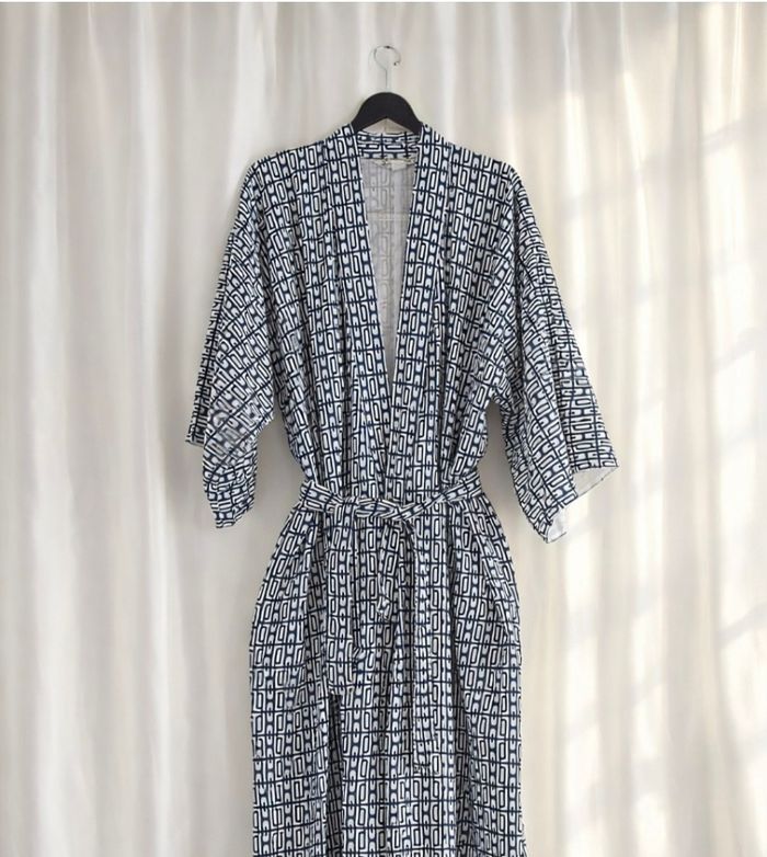 Ce magnifique kimono japonais vintage multicolore à motifs géométriques. - Type de produit : Kimono - Univers : Femme - Marque : Vintage Couture - Taille : Taille unique - Couleur : Multicolore bleu marine et blanc - Caractéristiques : Motifs géométriques, Ceinture amovible N'hésitez pas à me contacter pour plus d'informations ou de photos.