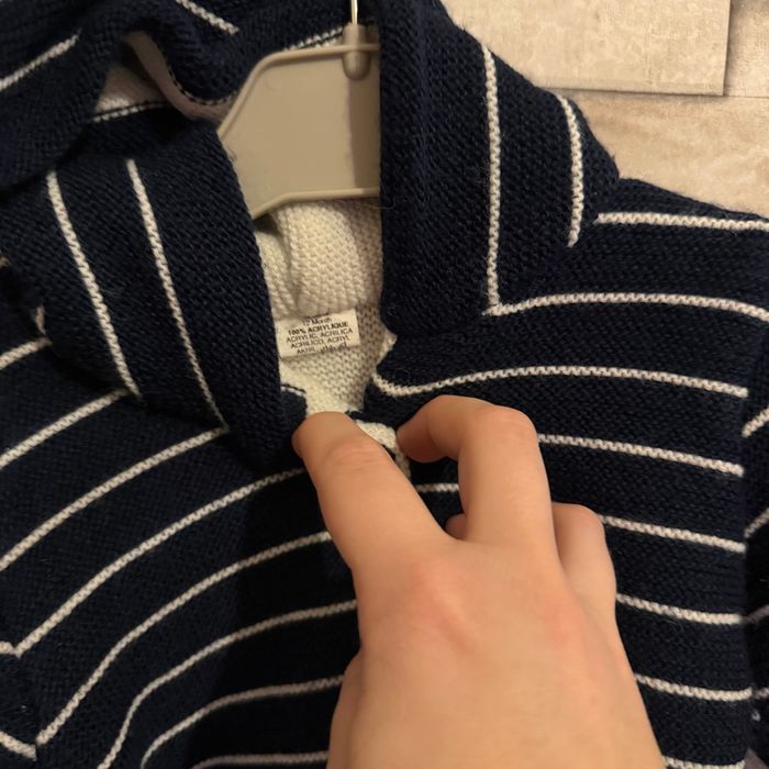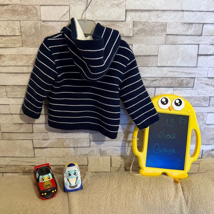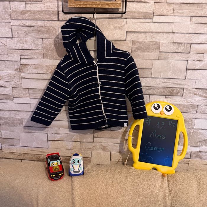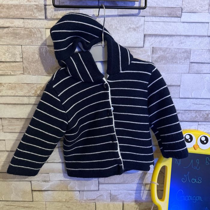 Gilet épais en mailles bleu marine à rayures blanches, capuche Taille 12 mois Très bon état #vetements12mois #vetementsgarcon #12moisgarcon #tresbonetat