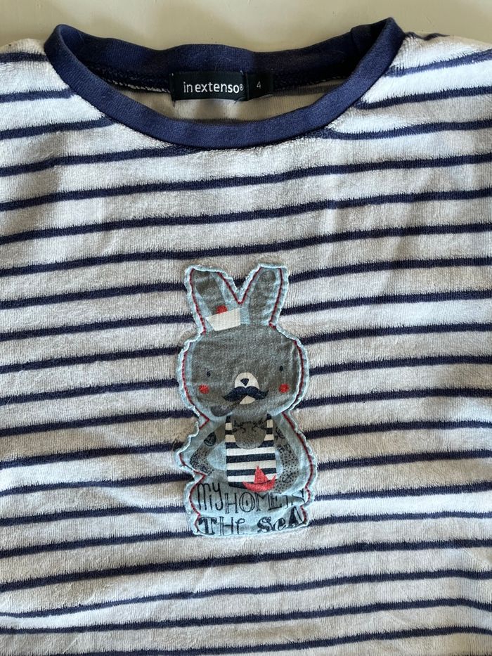 Pyjama rayé marin blanc/bleu. 1 haut + 2 bas. 80% coton + 20% polyester. Marque In extenso. Taille 4 ans