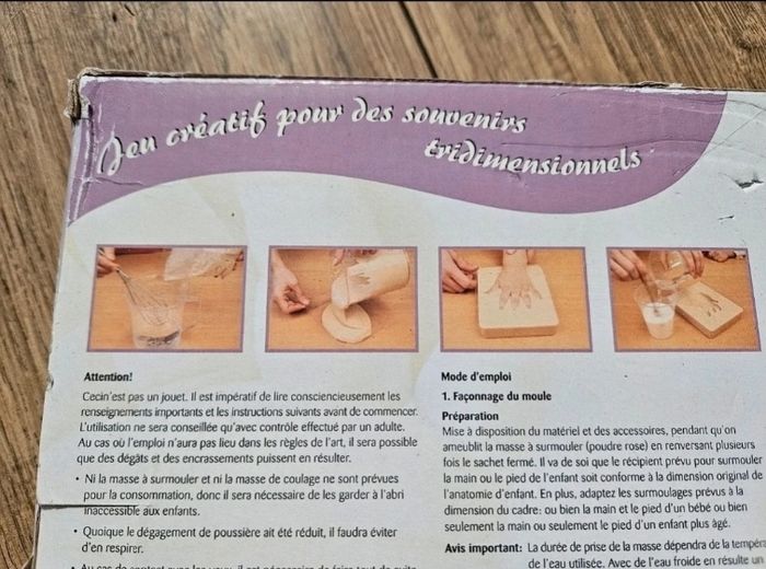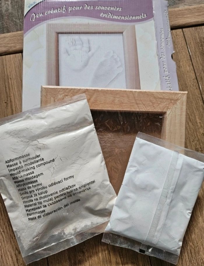 Cadre en bois et poudre pour moulage des empreintes des pieds et mains de bébé. Poudre blanche pour le moulage et rose pour le surmoulage Neuf, jamais utilisé #flagadajonesaccessoires #flagadajonesdecorationenfant #moulage #cadre #cadreenbois