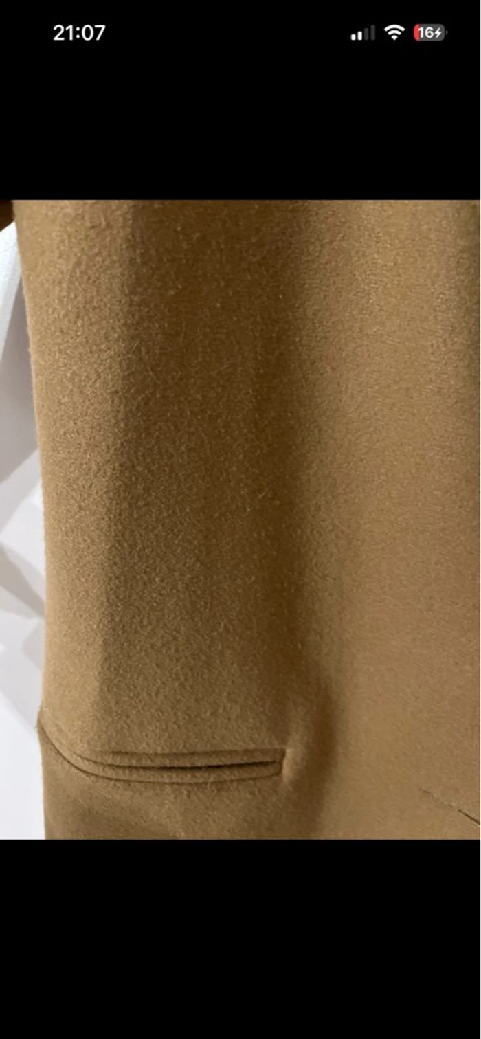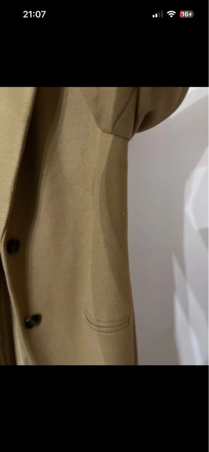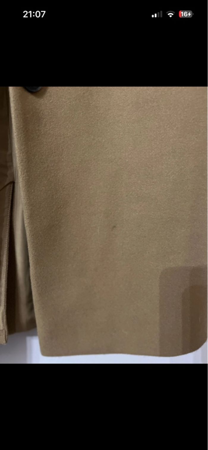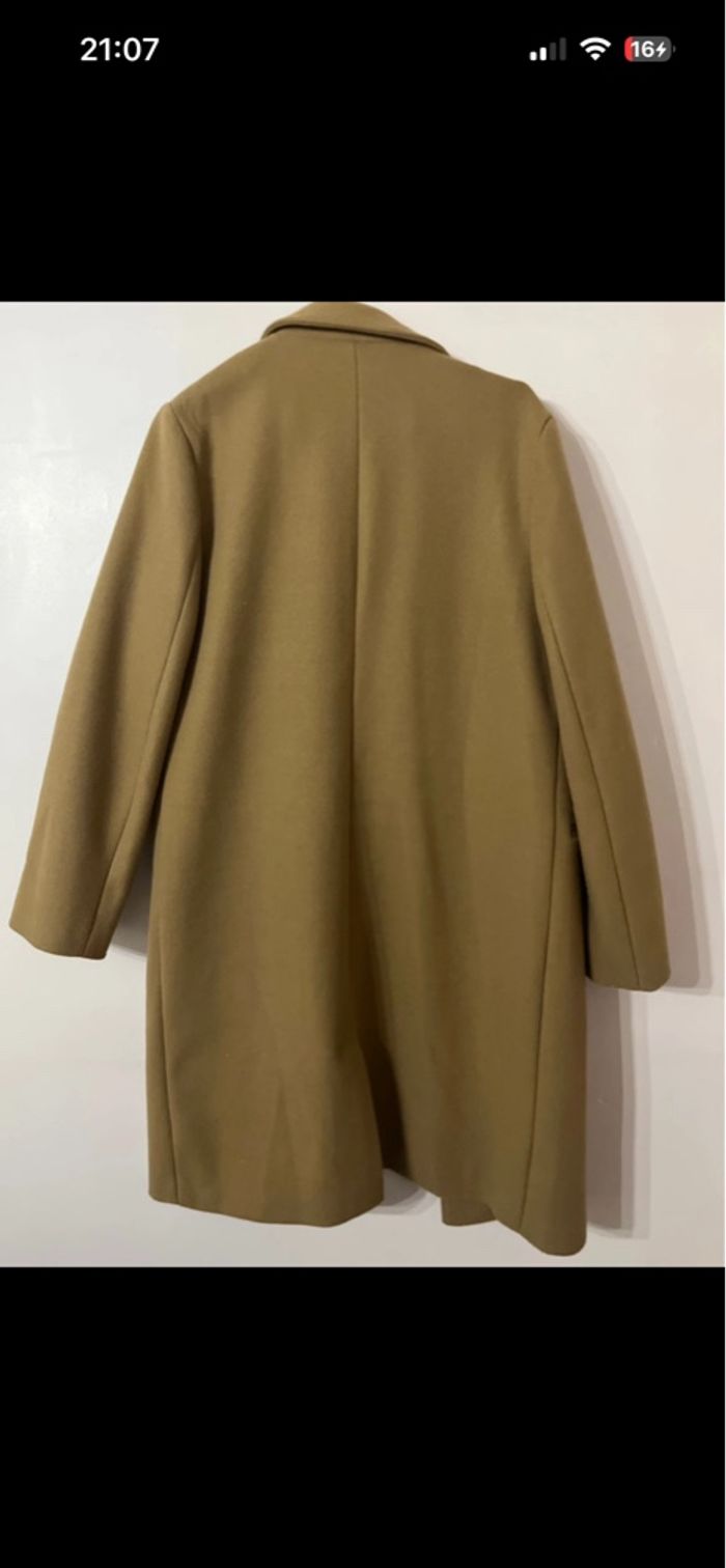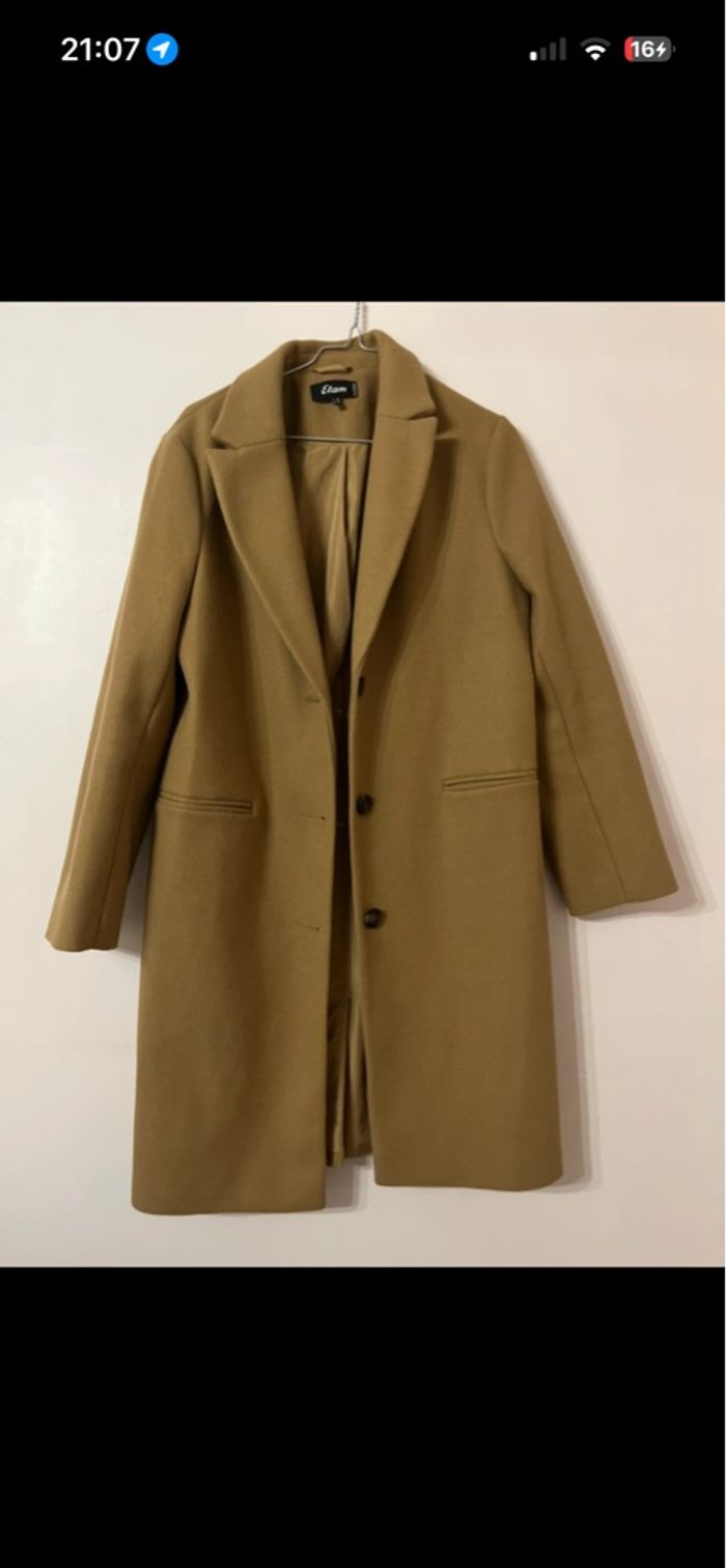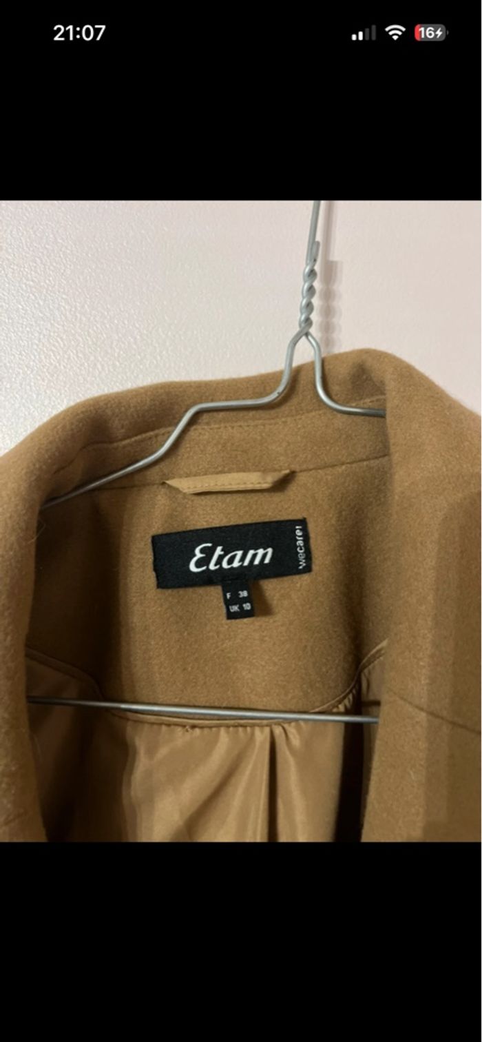 Manteau long pour femme de la marque Étam, en taille 38, de couleur camel. Coupe élégante et classique, Il se ferme par boutons sur le devant et possède des poches fausse Le manteau a été porté et présente donc des signes d’usure, notamment des bouloches visibles sur l’ensemble du manteau, ainsi qu’une petite tache. Cela reste toutefois un manteau tout à fait portable, encore chaud et structuré, parfait pour une seconde vie à petit prix.
