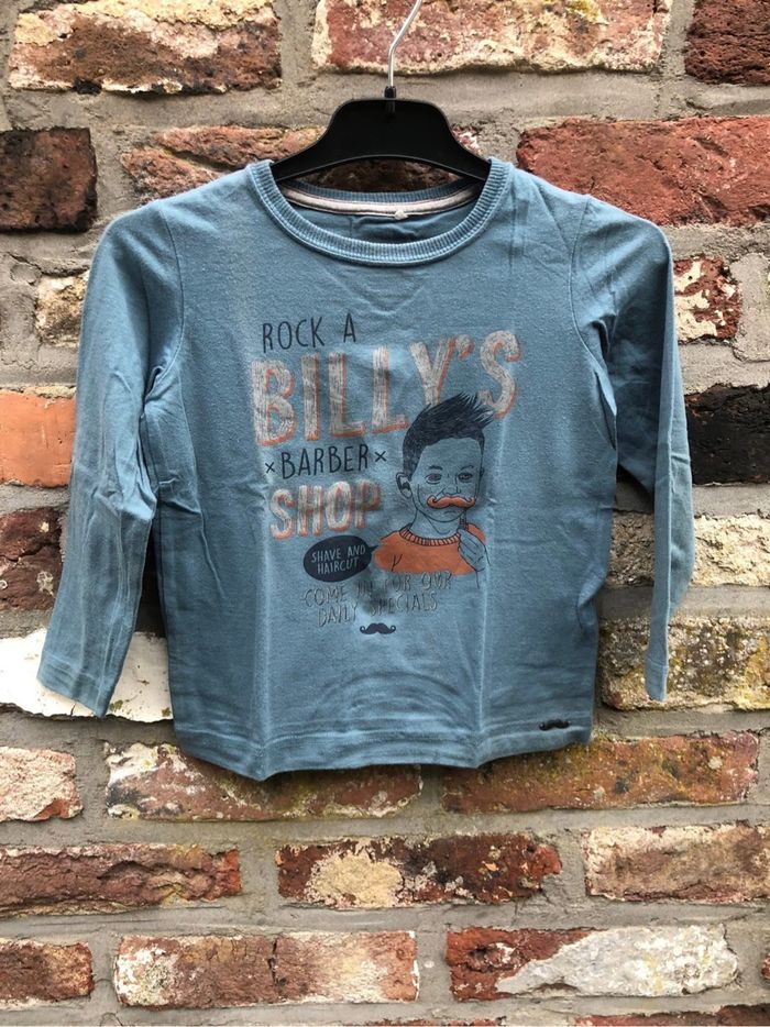 T-shirt à manches longues JBC, couleur bleu délavé, avec un imprimé vintage “Rock a Billy’s Barber Shop”. Style original et confortable
