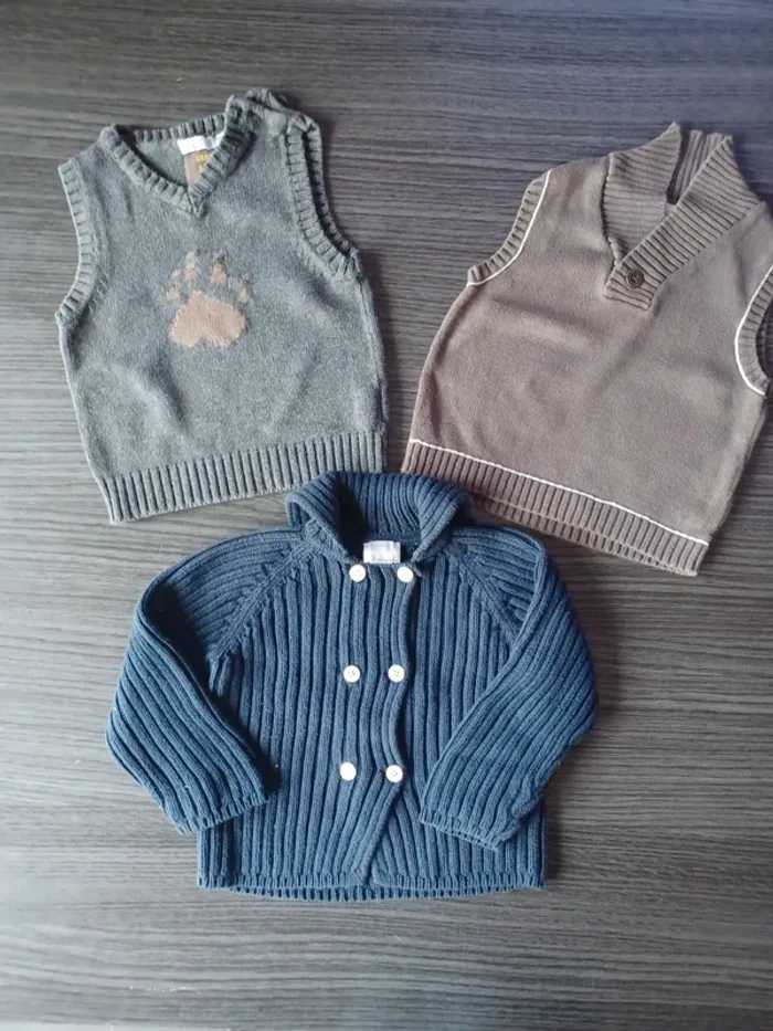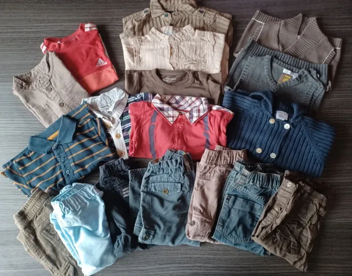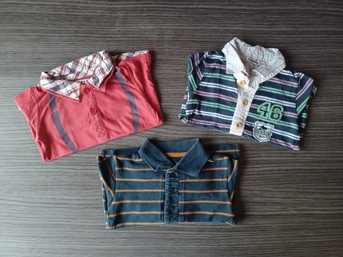 👶👶👶 3 polos manches longues 2 chemises manches longues 1 t-shirt manches longues 1 t-shirt manches courtes 1 chemise manches courtes 2 pulls sans manches 1 gilet 7 pantalons Marques variées : kid kanaï, kimbaloo, kitchoun etc Tout en très bon état, pas de tâches, ni de trous sauf un pull et un gilet que je mets en plus (le pull manques boutons, le gilet petit trou à la manche, voir 2 dernières photos)