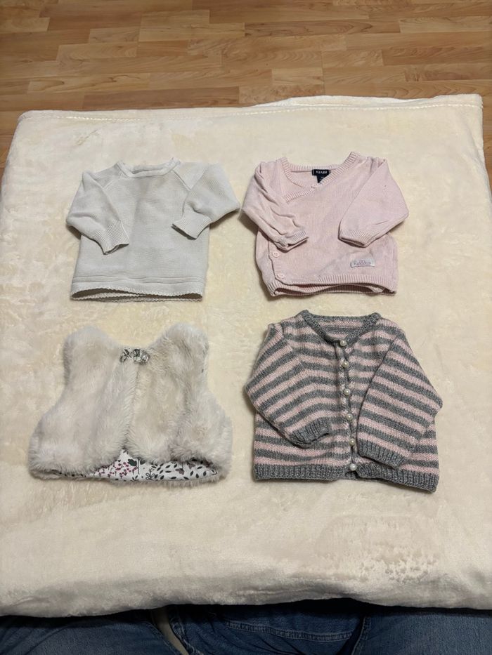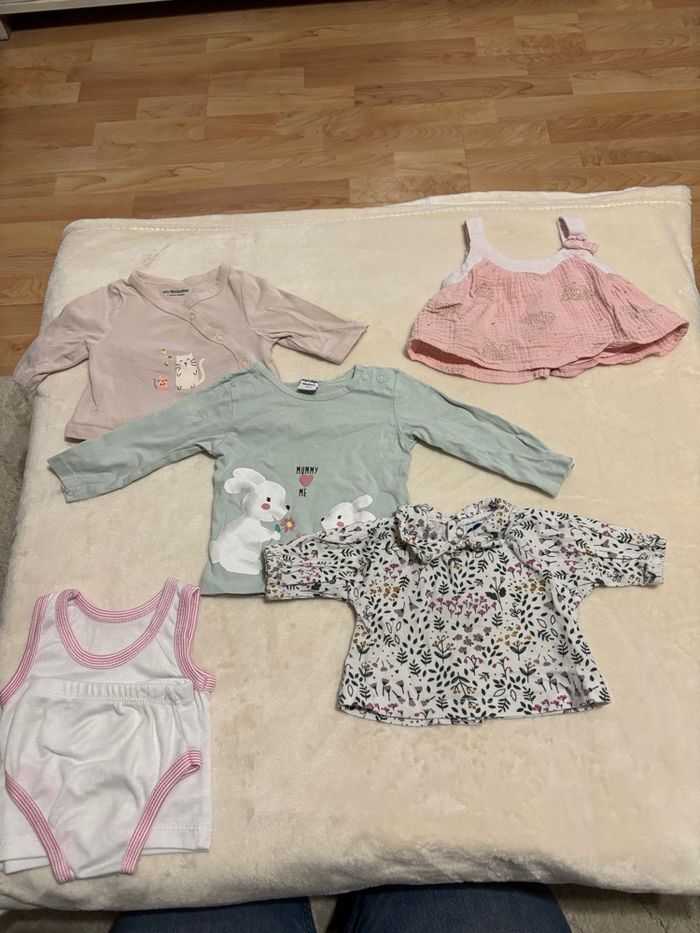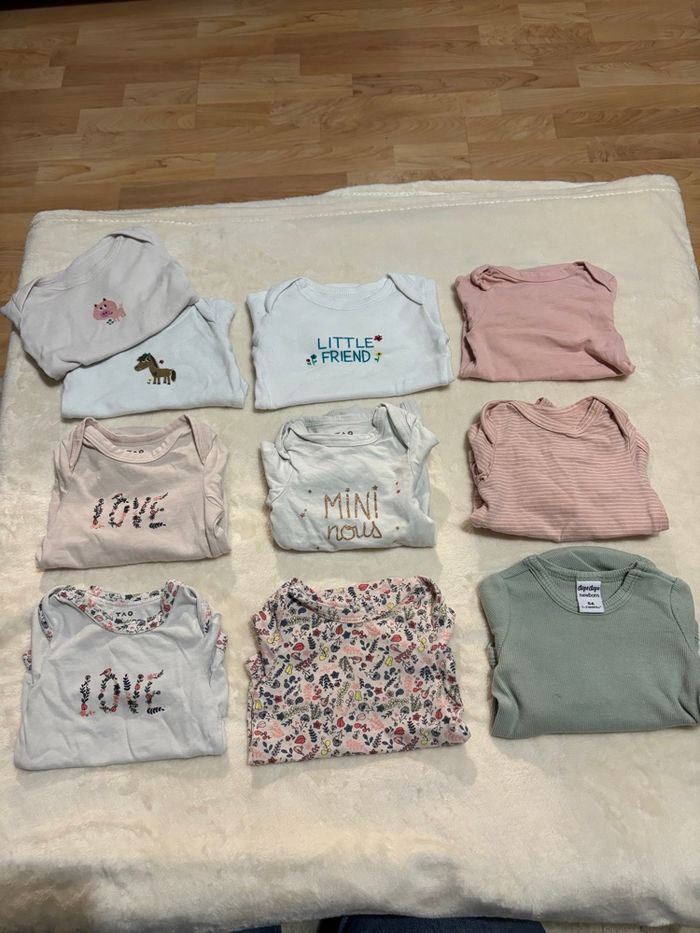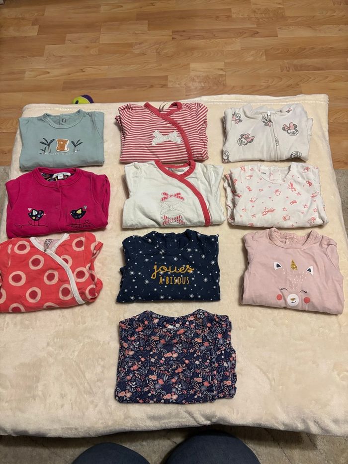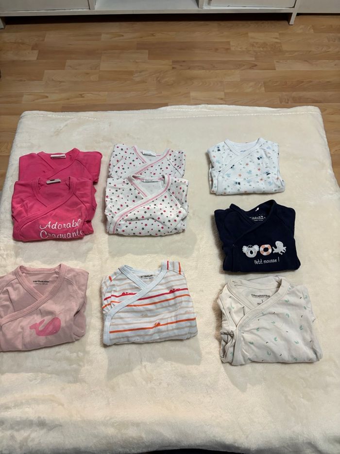 Bonjour/Bonsoir Je met en vente les habits en taille naissance et 1 mois que ma fille ne porte plus, dans le lot il y a : - 10 bodies manche longue taille naissance - 6 pyjamas chaud manche longues taille naissance - 3 pulls / 2 débardeur taille 1 mois - 10 pyjamas manche longue taille 1 mois - 6 pyjamas manche longue chaud taille 1 mois - 3 gilets en laine taille 1 mois et 1 gilet sans manche taille 1 mois - 2 robes taille 1 mois - 11 pantalons taille 1 mois ( 1 vert, 1 gris, 1 blanc avec des points, 1 blanc, 2 noir, 1 bleu marine, 1 violet, 1 gris avec pied inclus, 1 cargo couleur or, 1 jogging blanc fleurie) - 9 bodies manche longue avec ouverture devant taille 1 mois - 10 bodies manche longue taille 1 mois - 2 bodies manche courte (il n'y a pas les photos car je ne pouvais pas la mettre mais ils sont : 1 blanc avec des étoiles rose et 1 blanc avec des fleur dessus )
