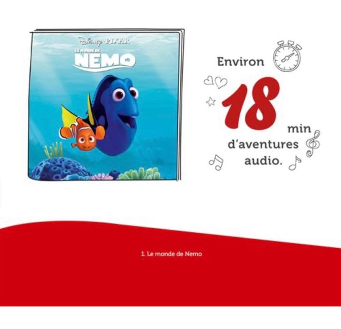 Avec votre Tonie le Monde de Nemo, plongez dans l’incroyable univers sous-marin créé par Disney/Pixar avec une aventure auditive haletante de 18 min. Les enfants dès 3 ans pourront s’embarquer avec Marin, un poisson-clown, et son amie Dory dans une mission ultra-risquée pour retrouver son fils, Nemo.
