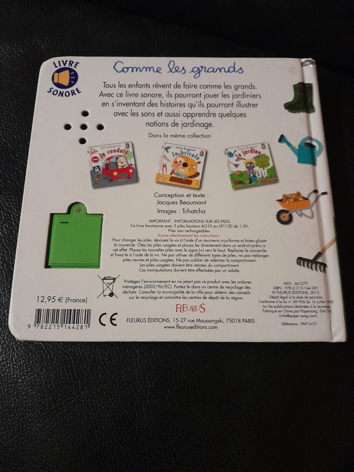Livre sonore "comme les grands je jardine" Le livre fonctionne parfaitement, juste 3 piles à prévoir Très bon état général Prix d'achat 12.95€