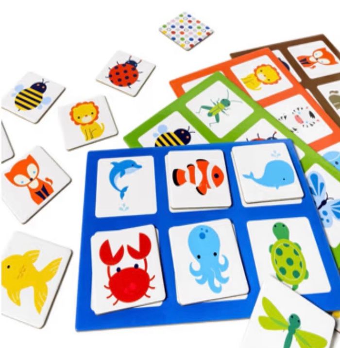 Ce jeu de loto invite les joueurs à découvrir et reconnaître les animaux en s'amusant ! Après avoir réparti les six planches en fonction du nombre de joueurs, chacun son tour, un joueur tire un jeton au hasard et doit nommer l'animal tiré. Le joueur ayant la planche avec le bon animal se manifeste et le place sur sa planche. Comme au loto traditionnel, le premier joueur à avoir complété entièrement son ou ses planches remporte la partie. Ce jeu du loto développe l'écoute et familiarise les jeunes joueurs aux animaux. Une carte légèrement abîmée.