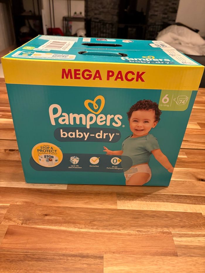 Carton neuf, 74 couches baby dry Taille 6 (13 - taille 18kg) Marque : Pampers
