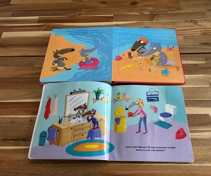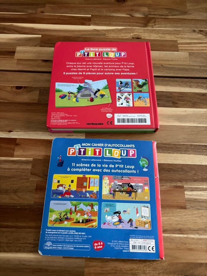 1 livre puzzle p’tit loup (5 puzzles de 9 pièces) de la marque Vert Baudet 1 cahier p’tit loup (les autocollants sont déjà collés dans le cahier) de la marque Auzou
