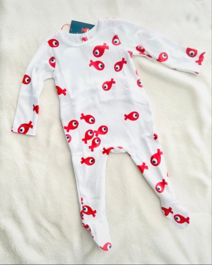 Pyjama en interlock de coton avec son impression iconique. Boutons pression dans le dos. Aucune étiquette qui gratte. 100% coton biologique (certifié GOTS ou Oeko- Tex).