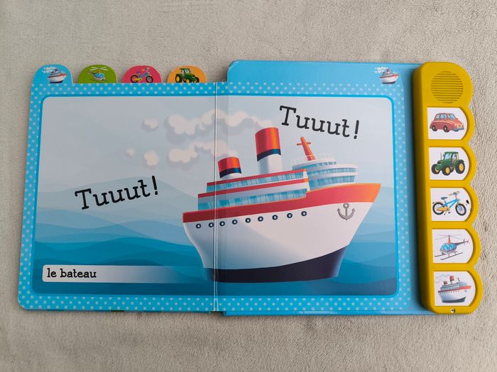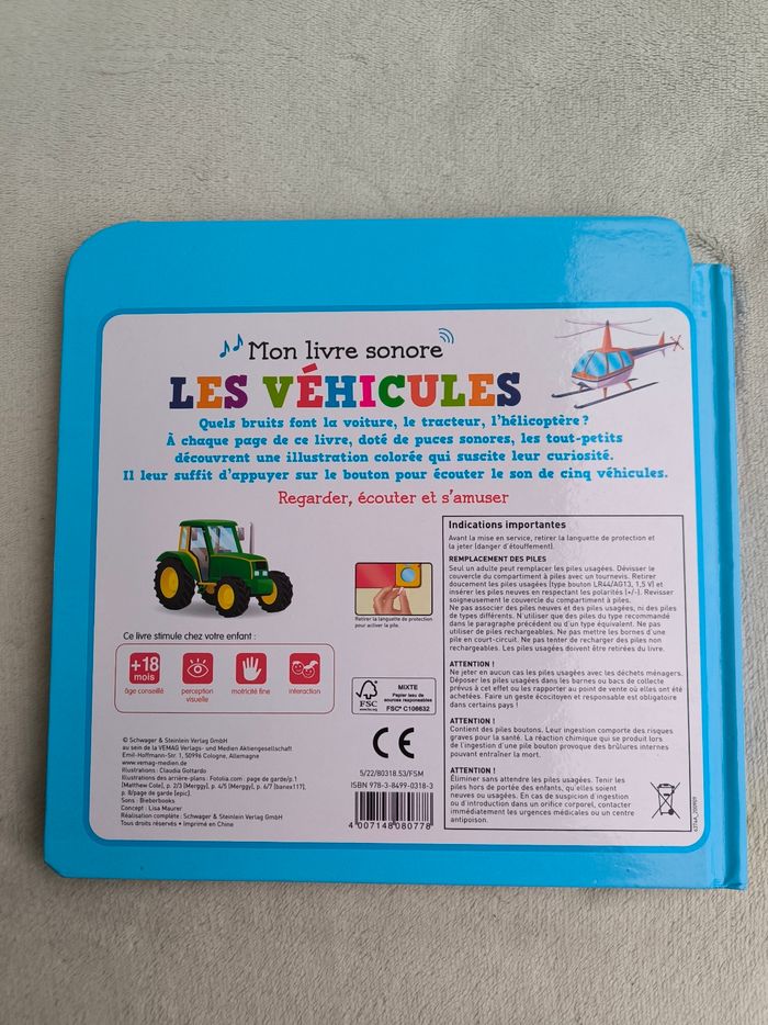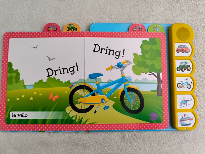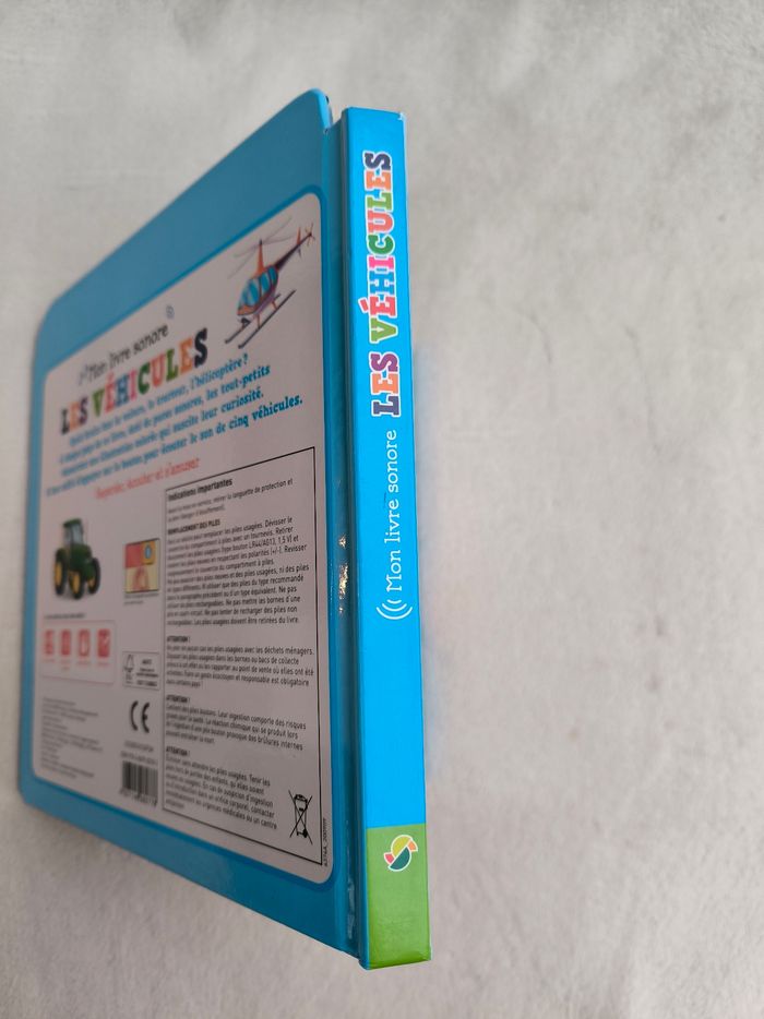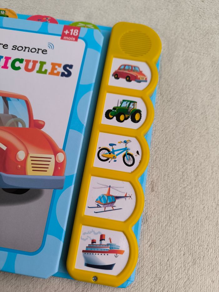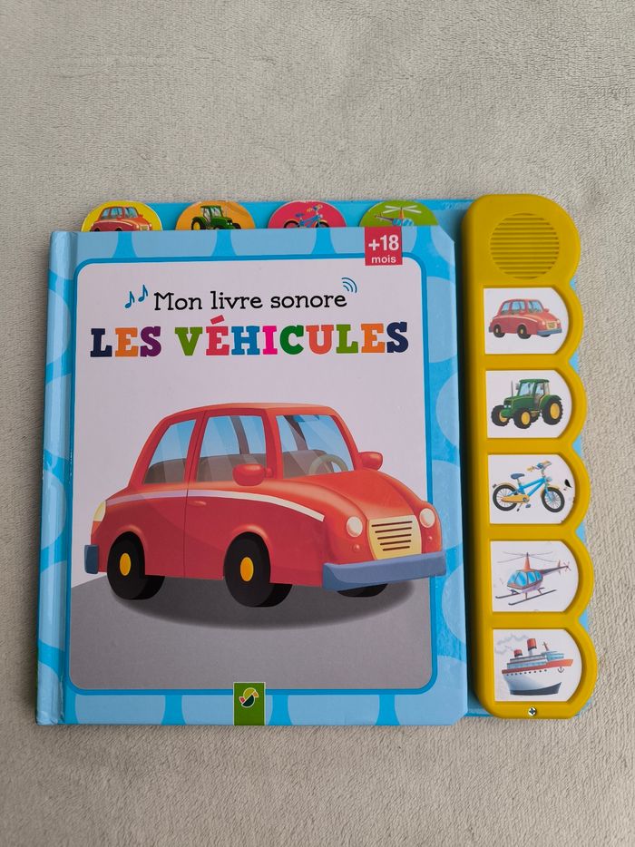 Livre sonore Les véhicules À partir de 18 mois • Pages cartonnées -> Voiture, tracteur, vélo, hélicoptère, bateau • Intérieur du livre en très bon état • Coins légèrement abîmés Fonctionne Piles incluses En très bon état #evelyne_livres