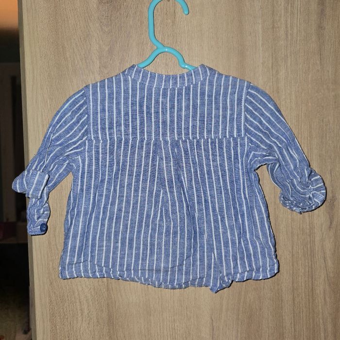Chemise rayée bleu et blanc Col maho Fermeture à boutons Les manches se retroussent pour devenir manches courtes Taille : 3 mois Très bon état
